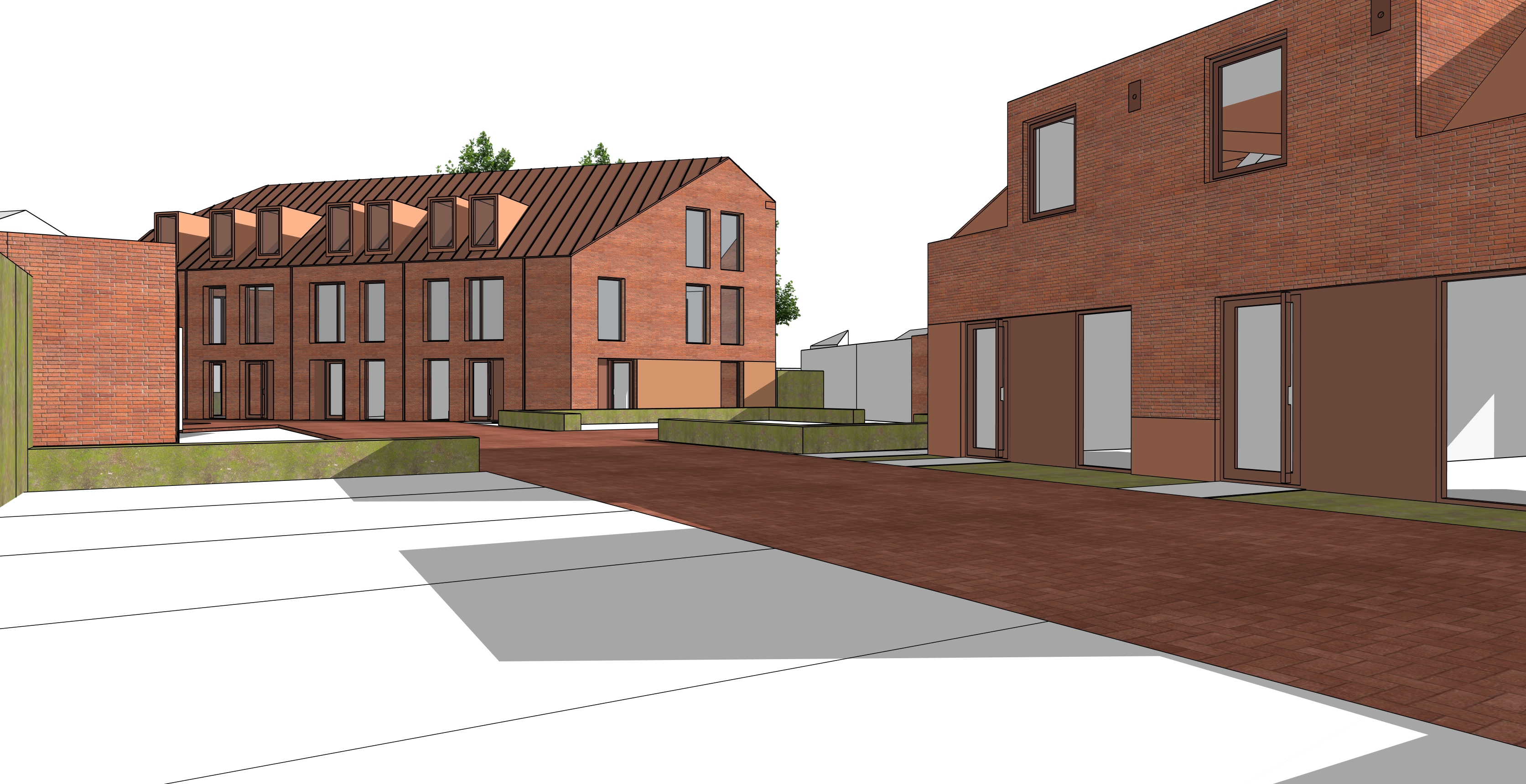 create a warm and inviting residential courtyard scene inspired by contemporary dutch architecture the main buildings should feature facades made of red brown mottled brick and window frames in an orange red brown tone the roof detailing must consist of vertical panels in a red brown color with a matte weathered texture adjacent buildings may appear more abstract while still maintaining a sense of neighborhood cohesion use the exact perspective of the provided reference image and do not alter the composition in any way between the sidewalk and the bottom edge of the window frames include a trasraam plinth made of pigmented concrete in the same color as the window frames place some softly draped open white curtains behind the glass to add residential warmth and interior depth depict an autumn like day in the netherlands with soft slightly diffused daylight and gentle warm tones with the sun positioned later in the afternoon on the right side of the scene include a tree with autumn foliage in front of the buildings on the left side of the street in front of the last building add an additional tree behind the main building add five big trees to create a natural backdrop include a parking area with a few cars and surround each parking space with a hedge approximately 50 cm high in front of the building add small garden areas with grass and flowering plants to enhance the residential character include a pedestrian sidewalk and use traditional dutch style brick pavers for the street surface add subtle landscaping and a few people walking or cycling to create a calm community oriented atmosphere llow some subtle visibility of modern interior elements inside the building with bedrooms located on the upper floors and a living room on the ground floor