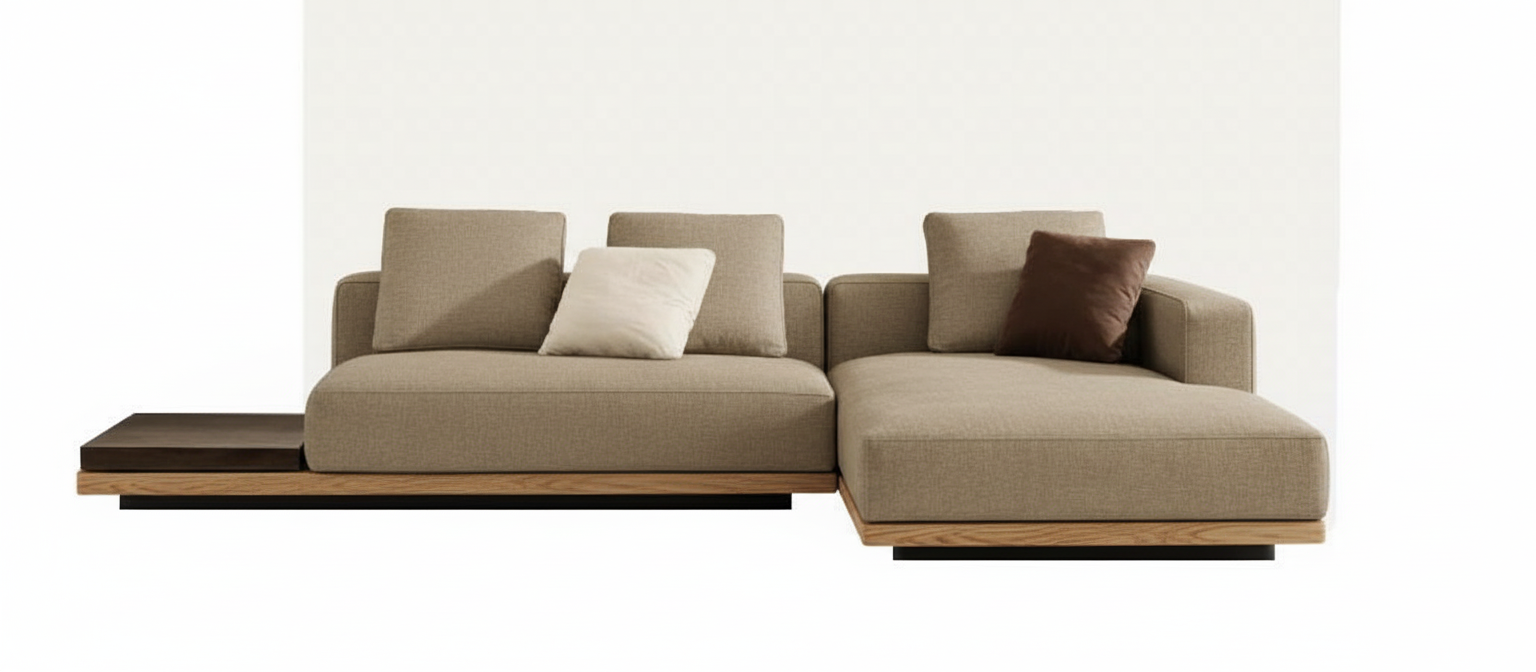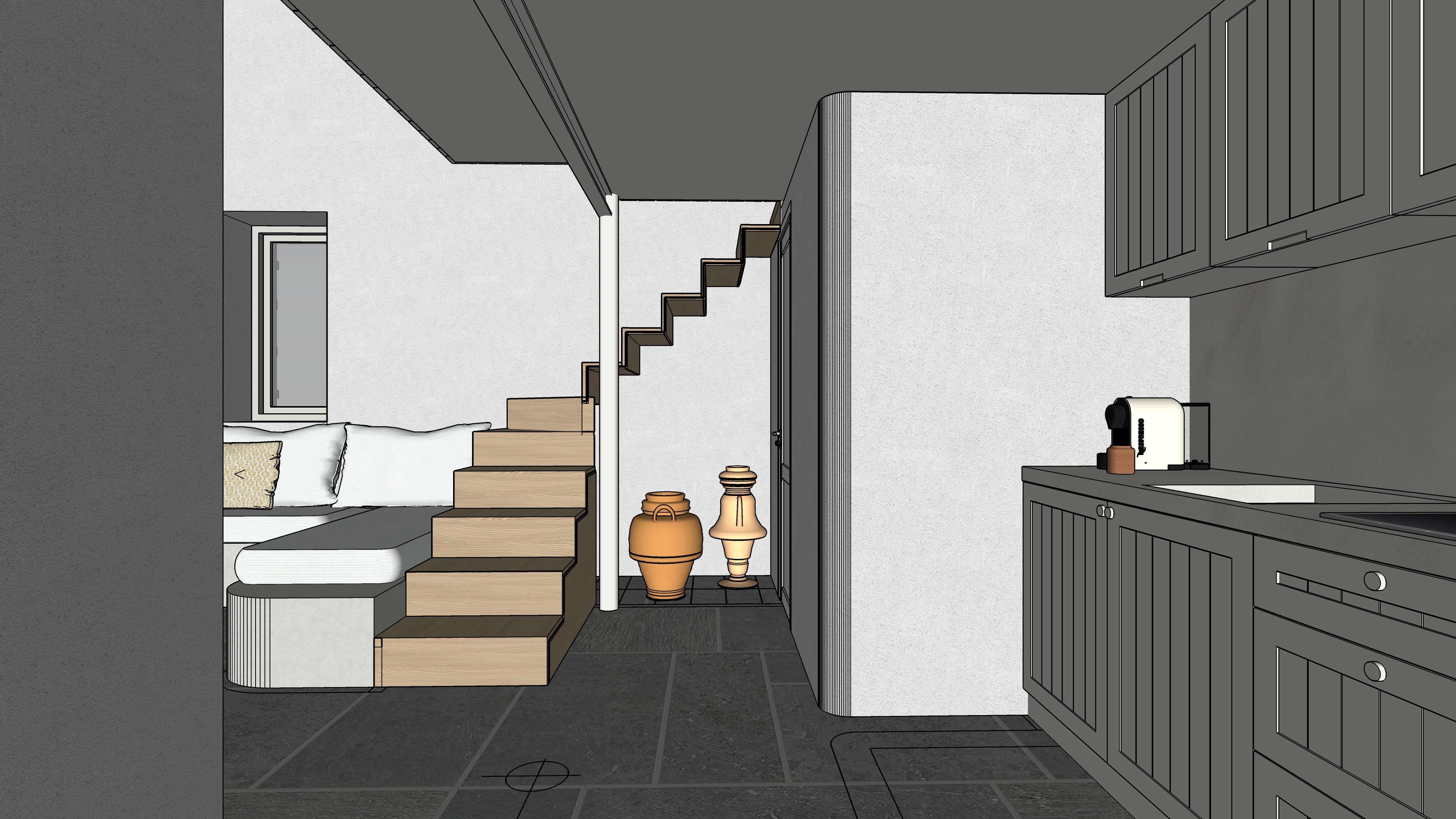 main prompt this is a cycladic house in kythnos the floor is natural gray pelion stone the sofa is white cement paint the sofa fabrics are light cream there is wooden stair leading to the mezzanine which is made of metal in white color and light oak wood the kitchen cabinets are white there is natural light negative prompt do not change geometry do not add objects do no change colors or materials
