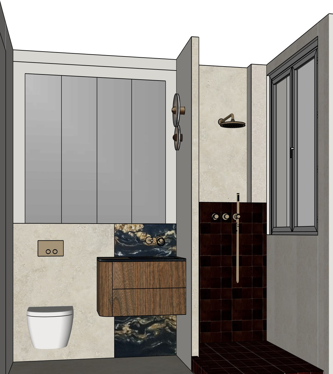 the walls of the shower are in marazzi grande stone tivoli beige the lower dark tiles are bordeaux zellige like this https www terredezellige com produit mosaique terre de zellige 5x5 cm sur plaque de 30x30 cm 07 marron fonce utm source google 20shopping utm campaign google 20merchant 20center utm medium cpc utm term adtribes gad source 1 gad campaignid 21838816043 gbraid 0aaaaa x61rg 1ptwv6cycwgae6hbo1dsh gclid cj0kcqjwqplobhciarisakrmpzqxeygkn6p30qfdgfpyqrn6jhgarinal 4kvoudqozejel xrtd0gkaargxealw wcb the wood vanity is in walnut the stone is black fusion quartzite the frame of the window is in light greige the four doors above the vanity are in mirror