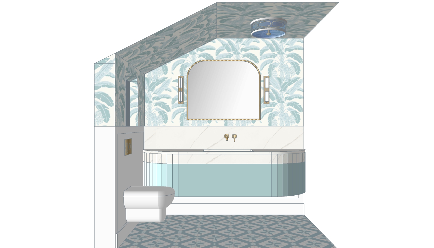 contemporary interior shot small luxury powder room with sloped ceiling half height white anels on the walls above the half way line covered in palm leaf patterned wallpaper in soft blue and white tones floor is tiled with geometric soft blue and white ceramic tiles floating toilet with brass flush plate custom curved vanity in glossy pale blue wood with integrated white marble sink brass wall mounted faucet wall mounted mirror with brass frame and two vertical sconces on either side ceiling has a matching palm leaf pattern and a central glass drum light fixture in blue and brass tropical elegant and coastal inspired aesthetic with soft diffused lighting architecture