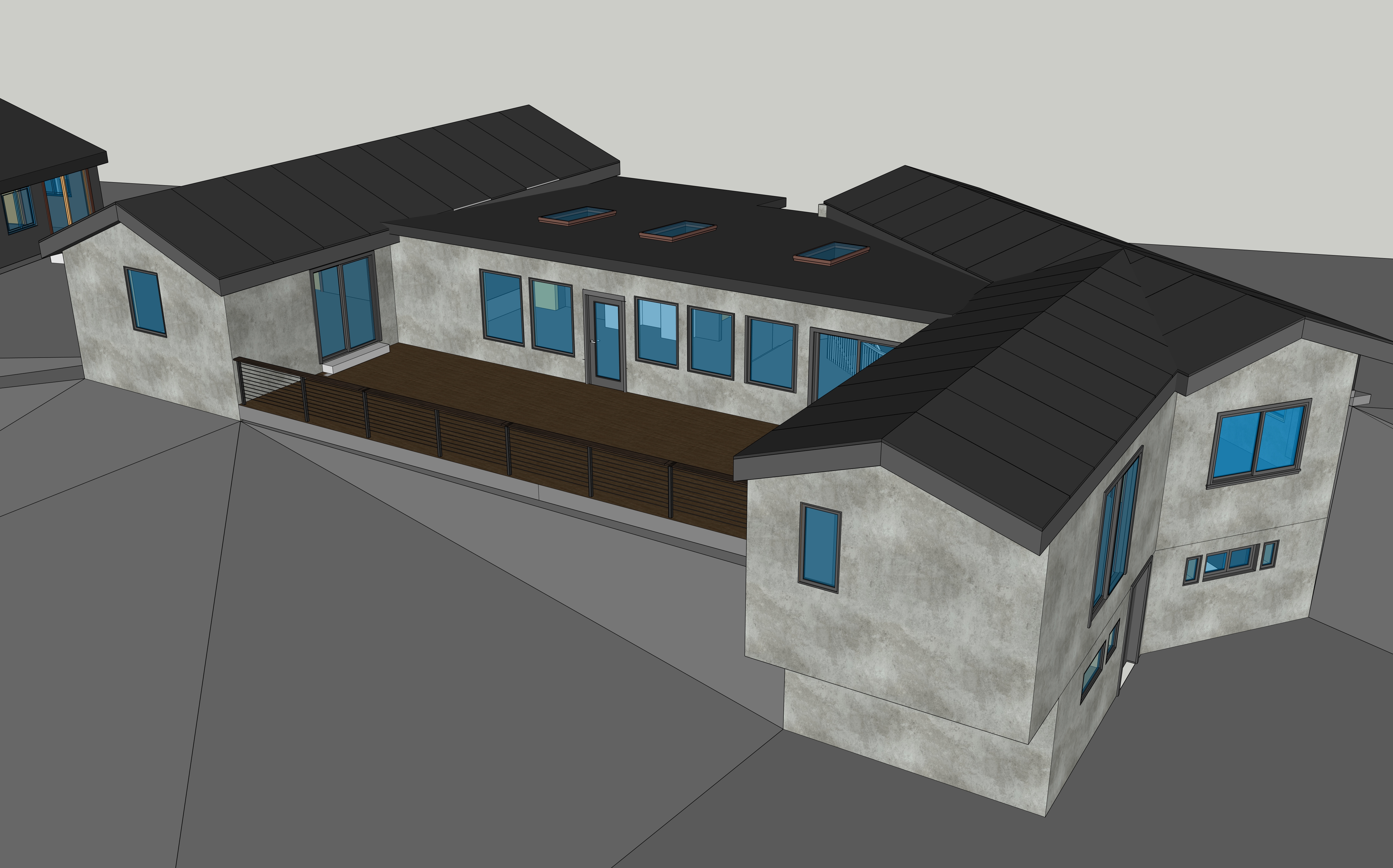 grey stucco wall finish and black metal seam on sloped roofs darker wood