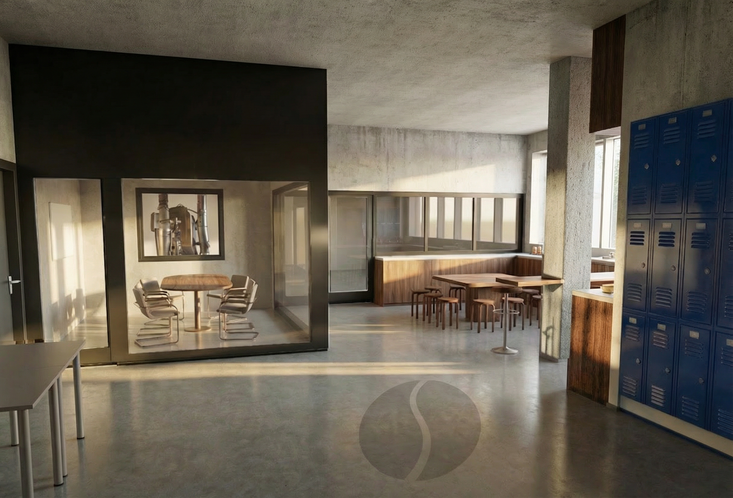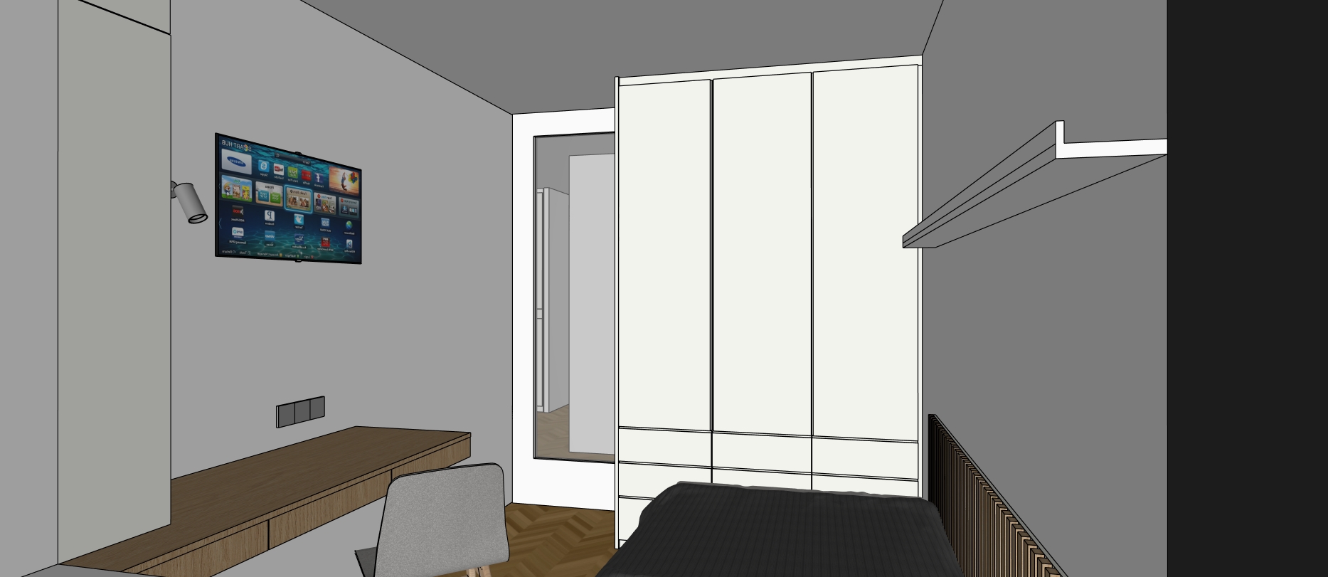 keep same interior design same materials and colors same furniture and lighting room door with milky glass keep all walls and ceiling in white color keep wood decor like on the sketch