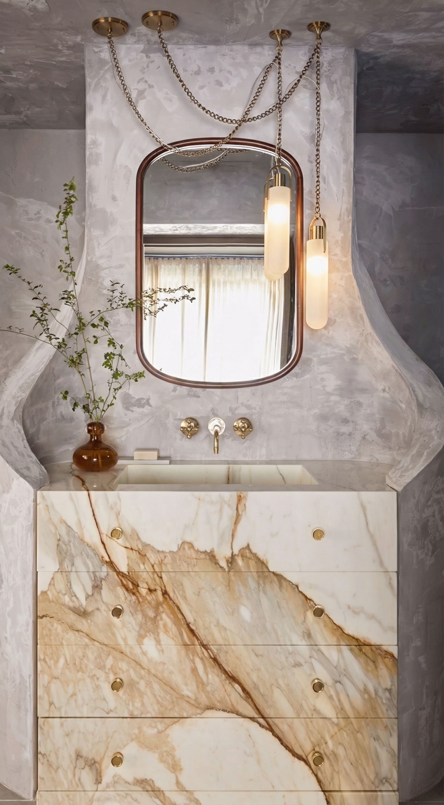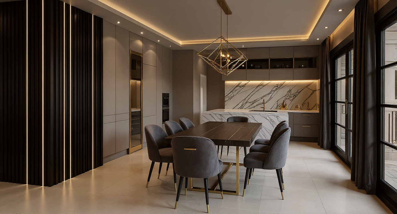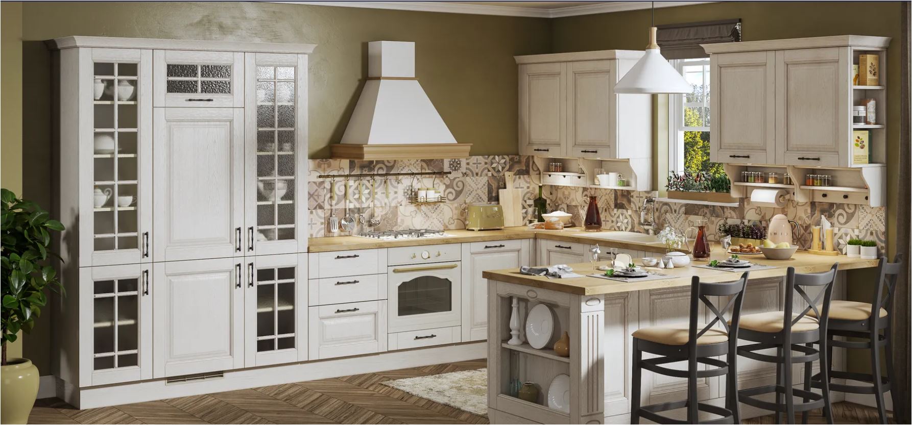 happy european women stay on the kitchen and look outside of the window outside is raining snow there is christmas tree with lights in the room the women is with home dresses without shoose she is relaxed and dring hot tea slowly it is night there is light from the kitchen