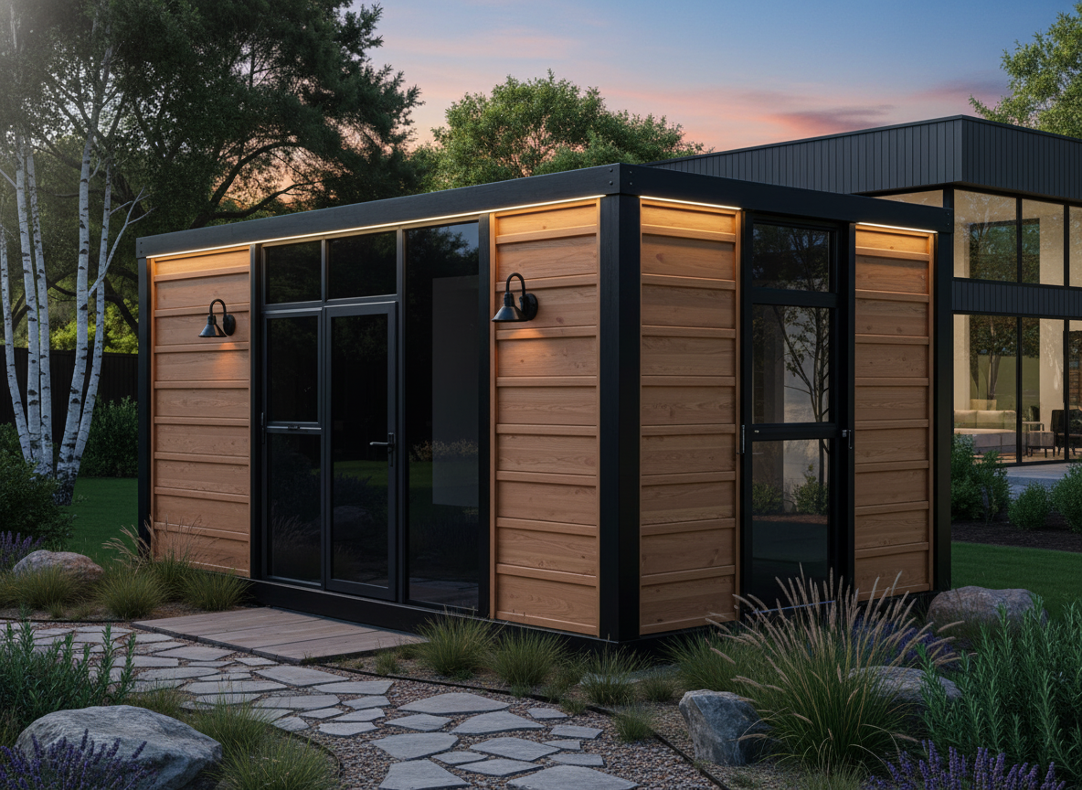 make this pod look like it is a dog grooming pod with a corresponding background landscape and setting also new extirior cladding and interior furnishing to match what a dog grooming pod would look like