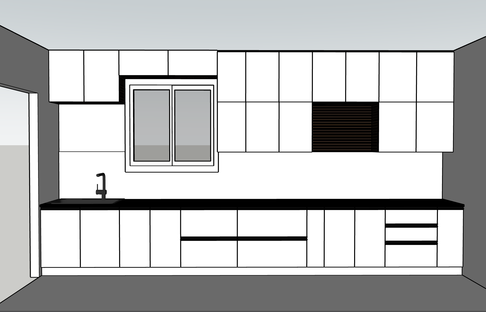 interior shot a modern kitchen interior sleek and minimalistic design cabinets in a crisp matte ivory finish with light wooden finish on the sides of the cabinets countertops a polished deep black granite glossy and reflective walls are a soft warm white adding depth and coziness the floor is a cool beige tile with a smooth matte texture a large window with clear glass allowing soft natural daylight to flood in creating a serene and inviting atmosphere faucets and handles in brushed stainless steel for a touch of elegance add a 4 burner stove and chimey also water purifier on the left corner the wall between the bottom and top cabinets will have a 2ft x 2ft tile with beige color and subtle texture with matt finish