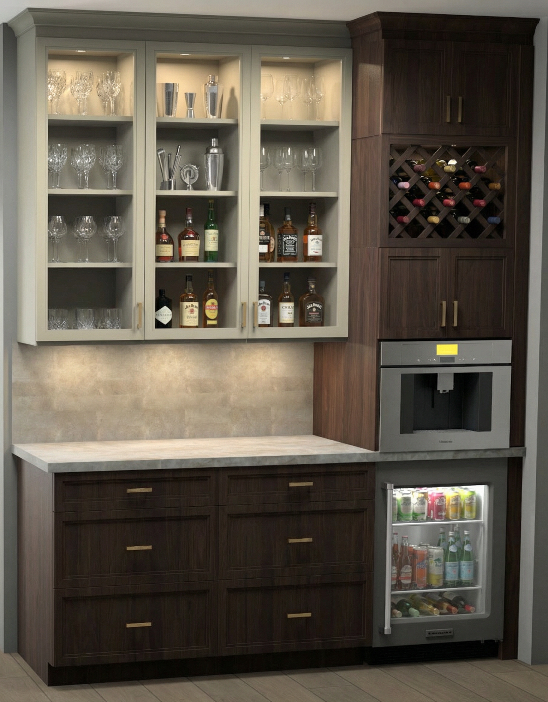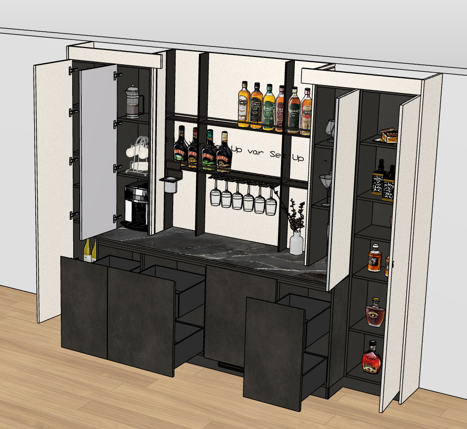 no led lights no linear lights no strip lights no cabinets lights no shelves lights keep original finishes brush dark steel for the bases and beige plaster for the tall units and back panels behind the metal shelves countertop is matt the inside of the cabinets is anthracite linen