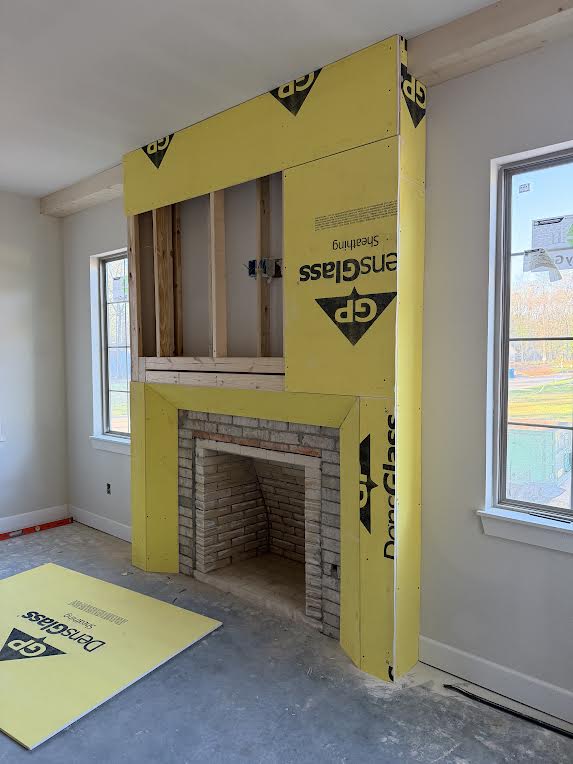cover the fireplace in a light colored stucco and add a wood colored mantle