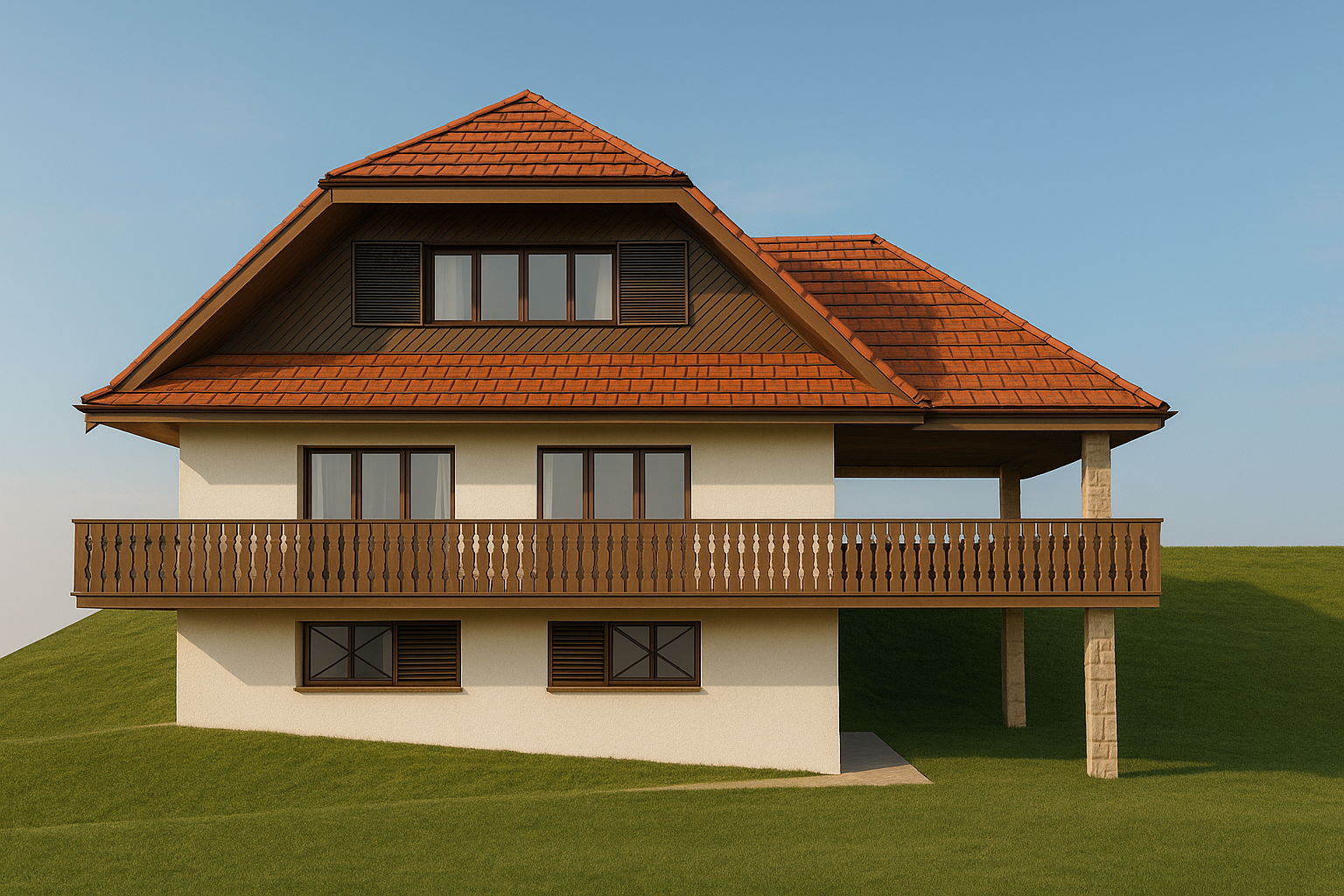 barndominium exterior shot in an australian rural setting at sunset with a lush green garden external colour pallette of white and soft grey architecture please keep wood color and roof tile natural color and the windows wood natural colors