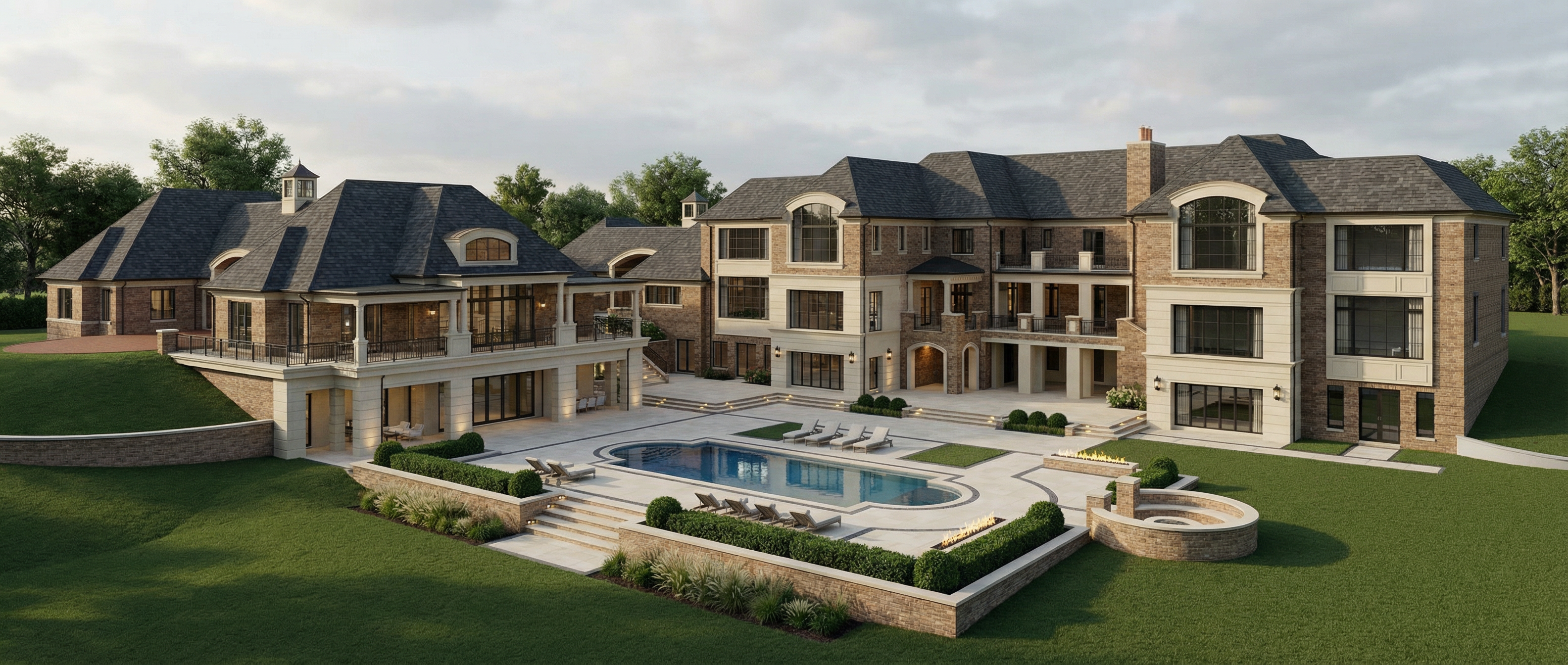 aerial view of a planned residential area seamlessly integrating nature and architecture render the image in a modern and clean style use a lush green for the park area with well defined walking paths in lighter gray the basketball courts should have a faded white outline surrounding landscape should have vibrant earth tones with vivid grass greens representing open spaces and gentle earth browns for patches of bare ground roads in the neighborhood are sleek dark gray with pathways in soft light gray the atmosphere should be serene and inviting capturing a harmonious balance between urban living and nature park should be like roberto burle marx remove cadastre lines