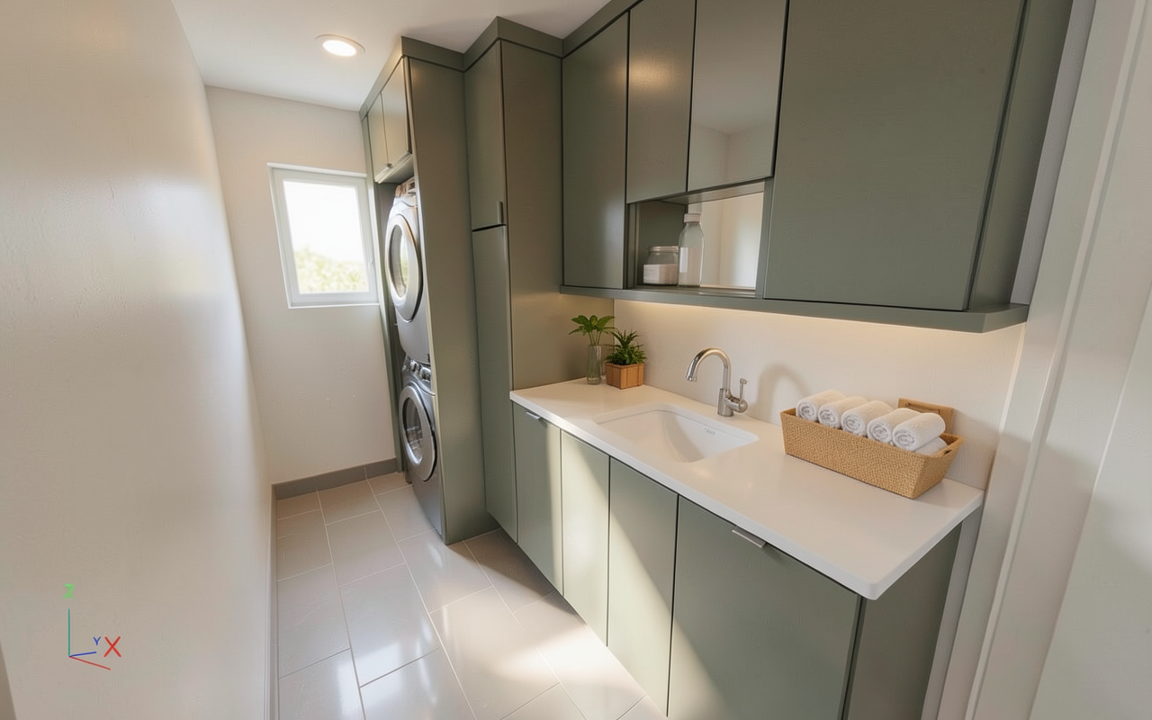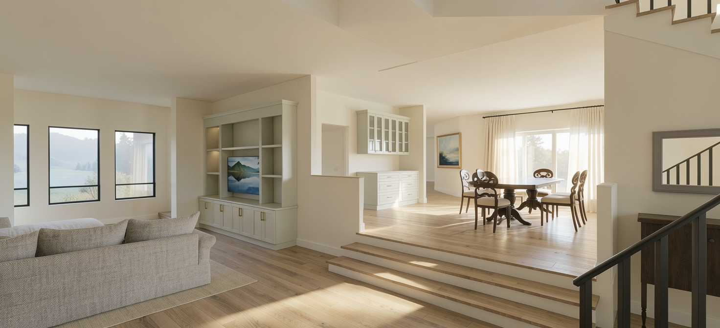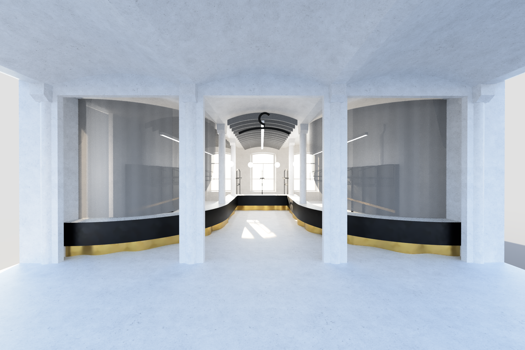 improve the realism of the provided interior render while strictly preserving the original composition and architectural intent strict rules must follow do not change camera framing proportions or geometry do not add remove or redesign any elements do not move or duplicate any objects do not reinterpret the scene scene understanding important the semi transparent grey surfaces on the left and right sides are existing sheer curtains there are no red panels anymore these curtains must remain exactly where they are and must not be replaced or moved allowed changes only these 1 curtain material refinement improve the existing curtain material to look like realistic white sheer fabric keep exact position shape and coverage unchanged adjust color from grey to natural white sheer curtain tone increase realism of translucency medium transparency add subtle vertical fabric texture keep the surface flat do not introduce new folds or volume 2 realism lighting enhance overall photorealism materials global illumination reflections contact shadows add natural sunlight coming through the windows in the background light should pass through the sheer curtains and create soft diffusion gentle gradients subtle light glow keep lighting physically accurate and balanced no dramatic beams or overexposure important do not replace the curtains they already exist do not add new curtains anywhere else do not modify any other materials or objects only refine the curtain appearance and lighting realism