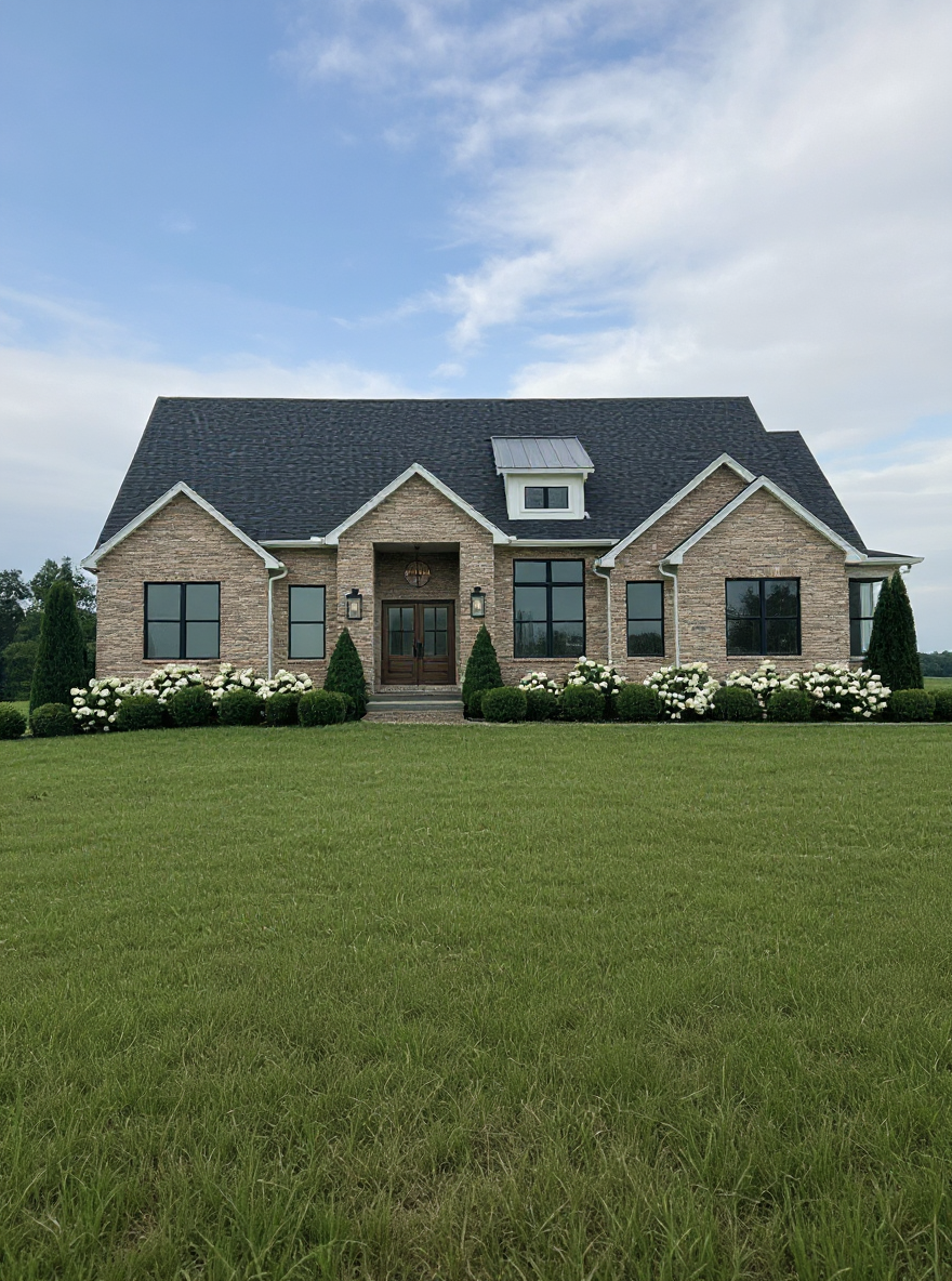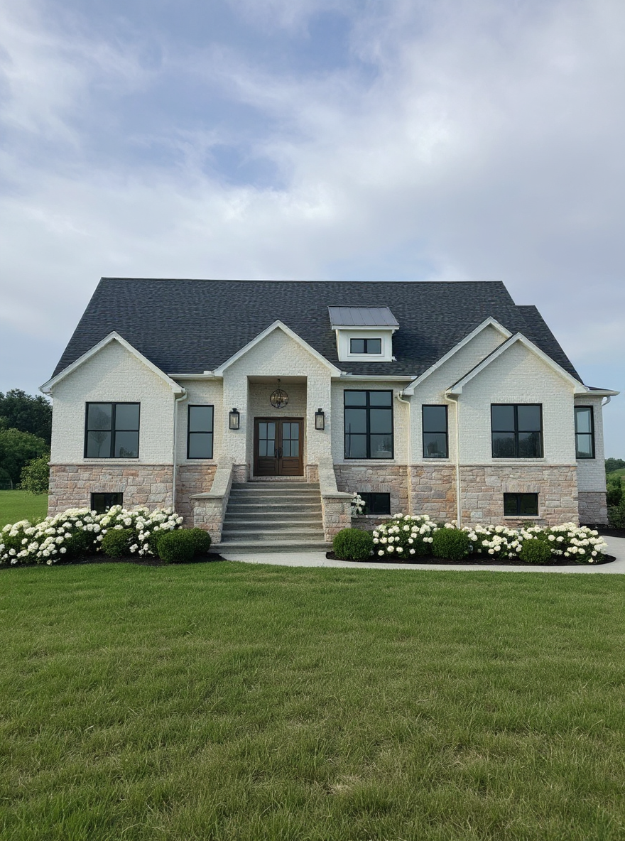 show a gray stone foundation wainscot up to the window ledges keep all other items the same