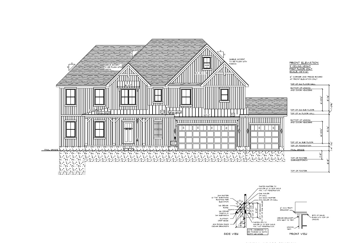 make a front elevation photorealistic as possible while keeping textures the same as shown lightly landscaped in a farmland area of croton ohio nice lighting remove any text use the following finishes 65625d board and batten siding 65625d trim black windows poured concrete foundation white board and batten shutters pewter certainteed dimensional shingles 43413f metal roof where shown white 3 lite craftsman 2 panel front door ad6638 posts