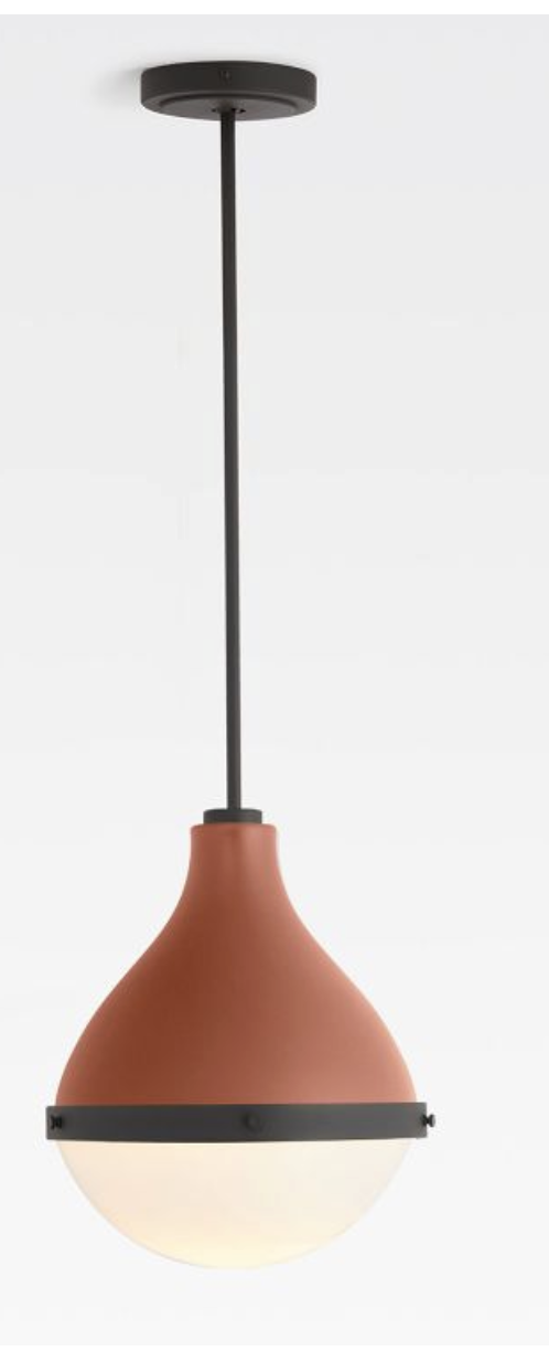 create a beautifully detailed rendering of a modern pendant light hanging from the ceiling the light fixture has an elegant teardrop design the upper part of the light is a warm terracotta red while the metal fixtures and rod are a sleek matte black the lower half of the light is a soft frosted white giving a gentle glow surround the scene with a minimalist and contemporary atmosphere emphasizing the light s striking design and warm inviting color palette architecture