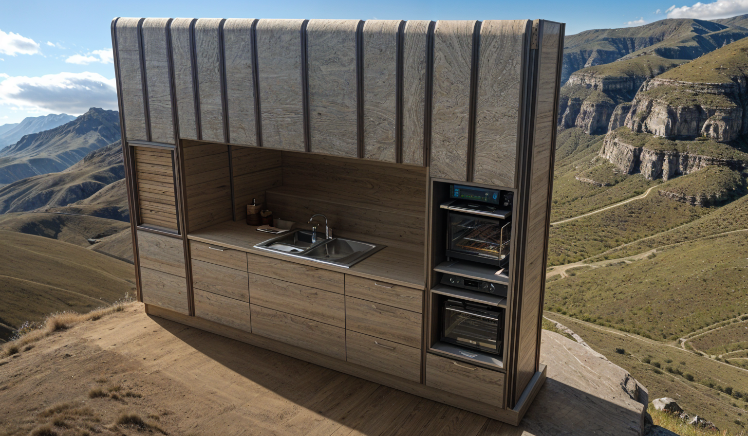 cabinets are a plain matt black the cabinets on the left hand side are 2 doors above and a roller shutter door instead of an oven please add some downlights in front to illuminate the front of the cabinets a bit more