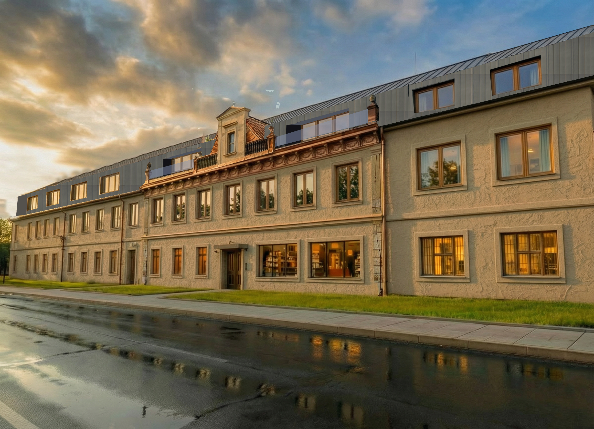 black rheinzink roof wooden windows light up intertiors summer midday wet road few shrubs by facade capuccino plaster facade keep glass railing in roof