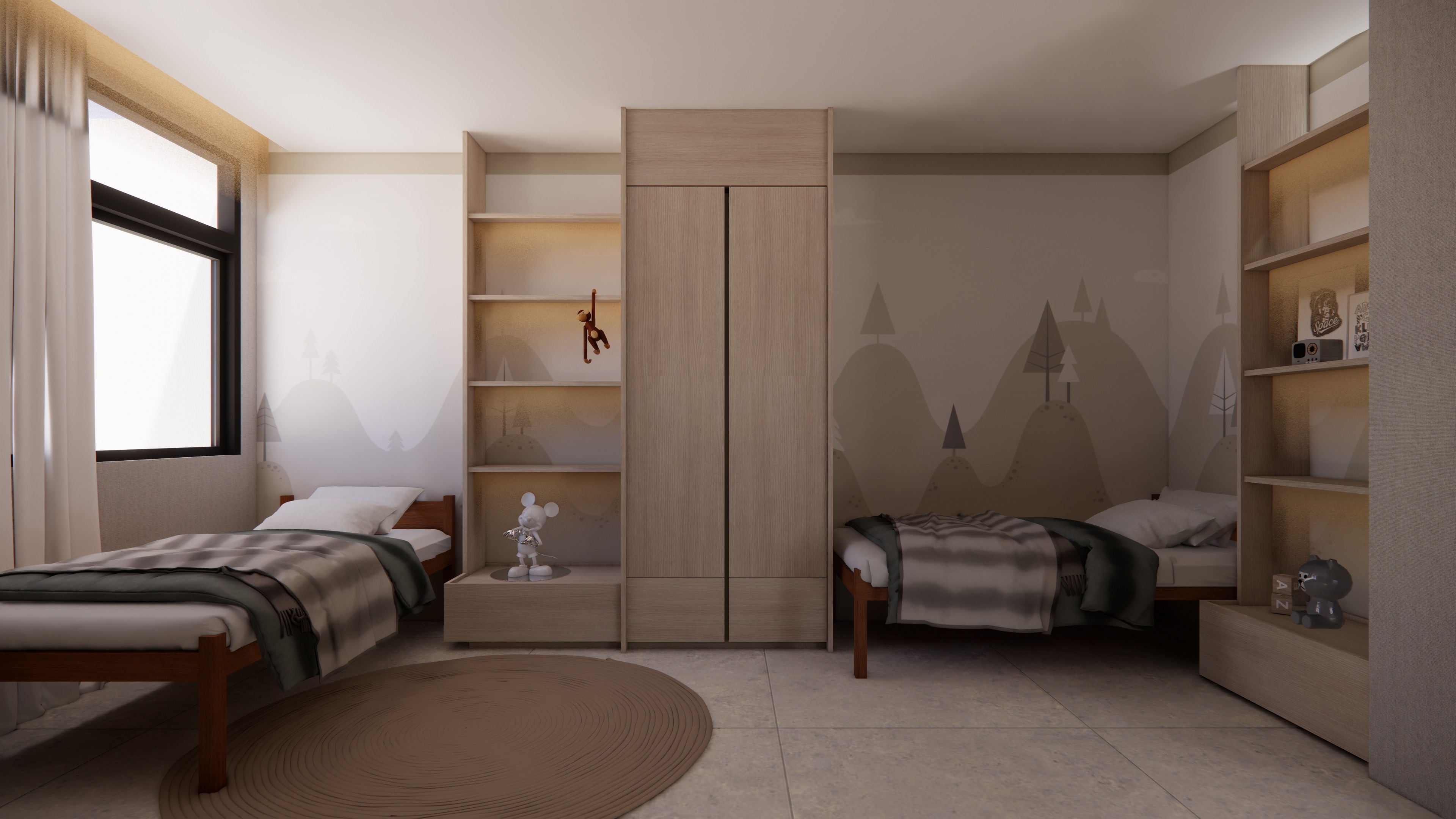 enhance the lighting quality only ensure all linear led lights and table lamps are switched on and properly illuminated add a few subtle toys placed neatly on the shelves for realism without altering the shelf design or materials improve lighting balance to achieve a warm natural and realistic atmosphere without overexposure keep the space bright clear and well lit do not change the design layout camera angle or material proposal maintain all original materials and finishes exactly as provided enhance realism through accurate lighting shadows and material rendering only produce a clean professional photorealistic architectural render
