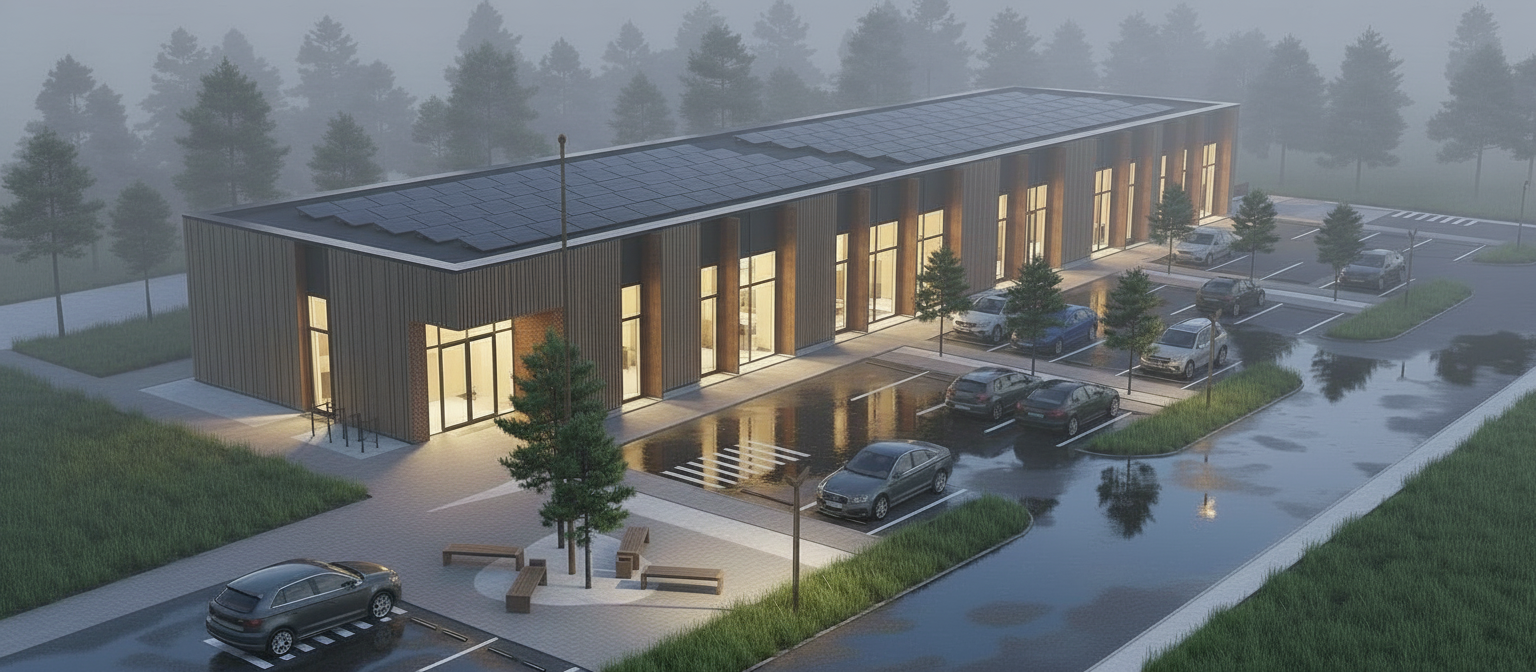 exterior shot do not change the photo and keep everything as shown only add walking people on the sidewalks in the photos in the middle and on the left on the flagpole hang a non fluttering lithuanian flag architecture