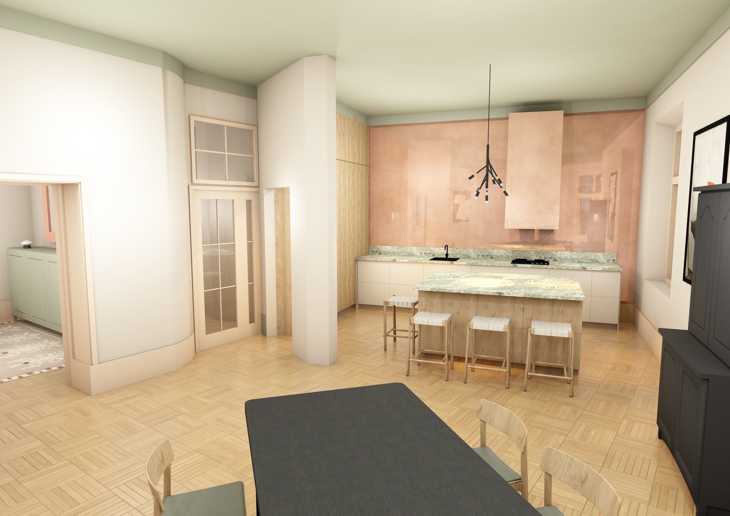 make it more photo realisti but some tableware on the table like dinner plates wine glasses bottle and make it look like a nice dinner setting not to formal though the whole back wall should be in copper as well as the kitchen fan the cieling should be the same green color as the cornice make the kitchen area a bit more lit up as daytime please even more please the wall in the back of the kitchen should be copper like tha kitchen fan but not so shiny but keep the picture bright as it is it should be daytime with lights in prom the window on right the kitchen cabinets on the back should be beige not green tha copper in the back should be less shiny the fan should also be copper and the kitchen table black