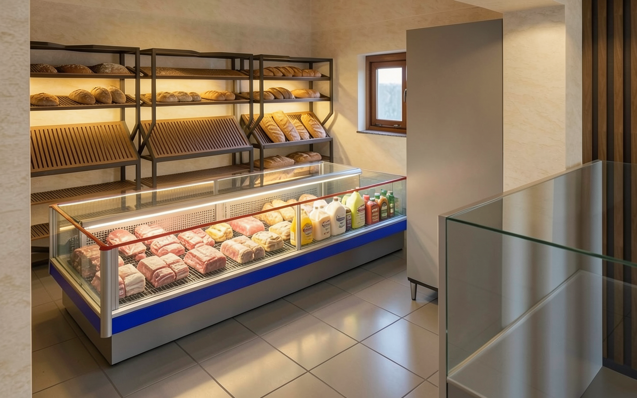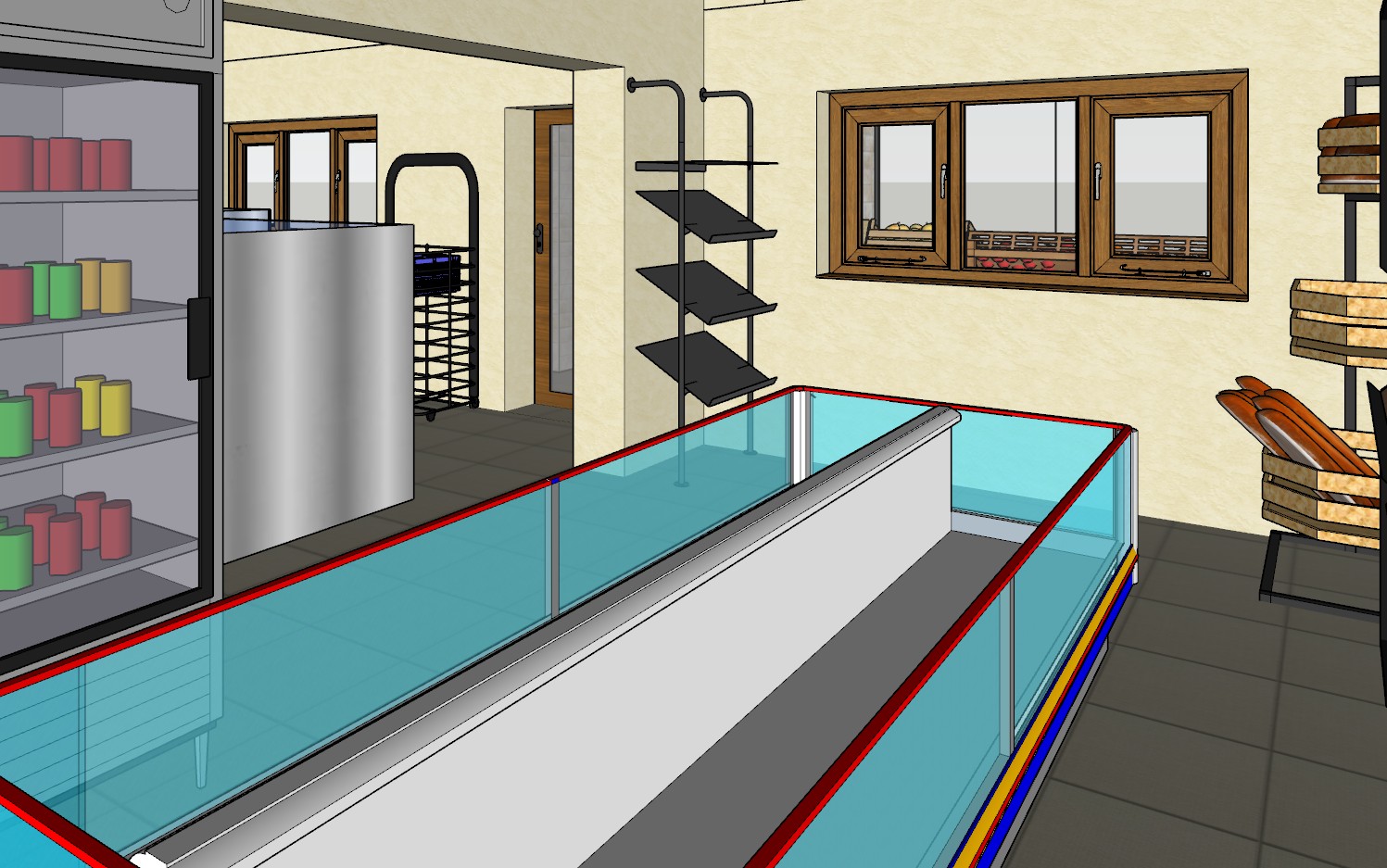 this is a side view picture make it real and add lights and some random meat and lactate products in the glass display place some bread on the wooden shelfs in the back