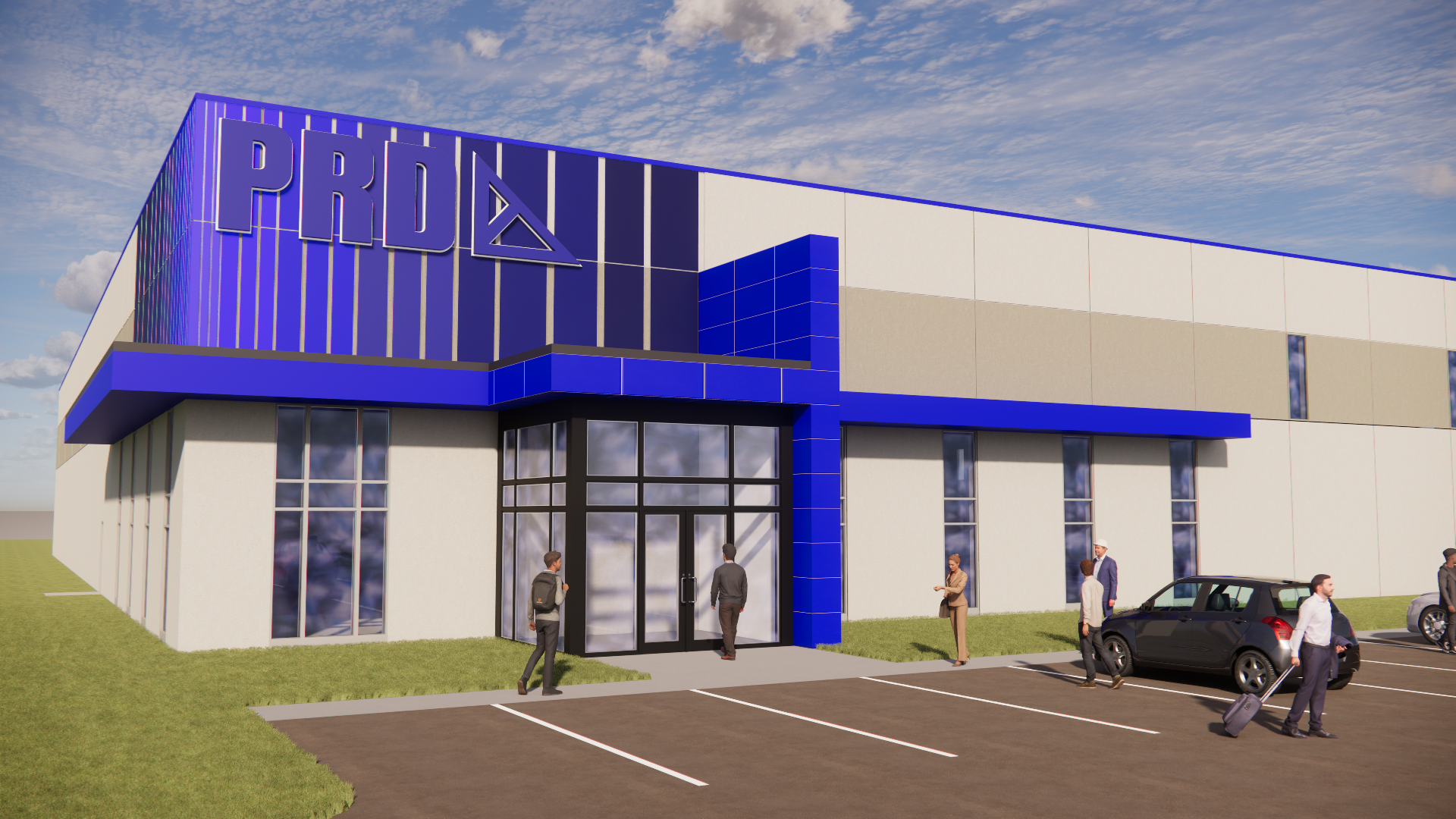 precast commercial building with a full glass vestibule as shown asphalt parking lot and some small trees in the far background flat gradient blue painted precast panels up top by the logo from light blue to dark blue