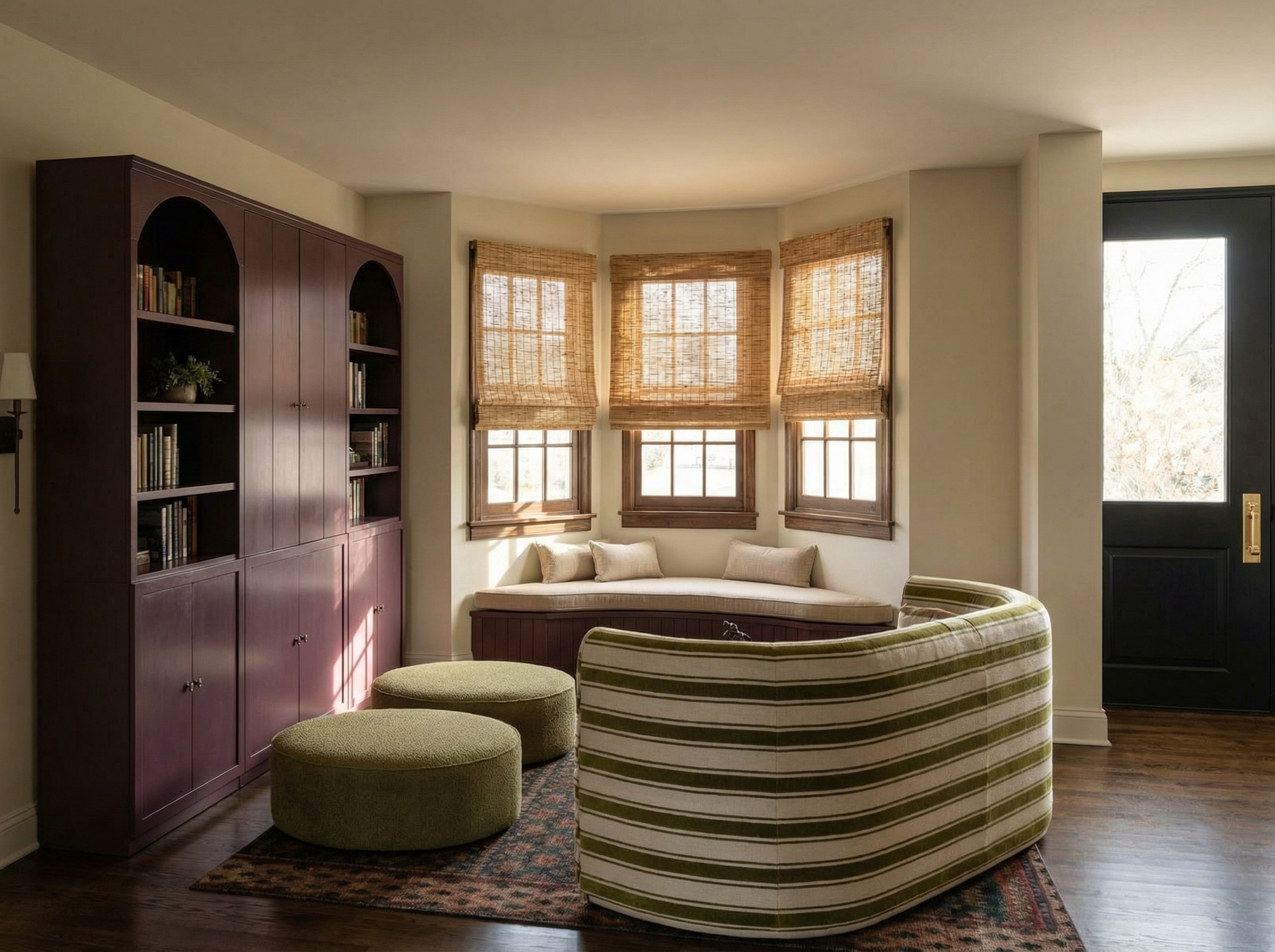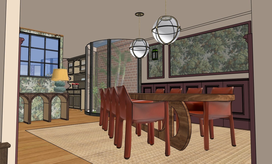 keep the wooden hues to original as the uploaded image keep accurate keep everything the same exactly the paneling on the wall is preference red by farrow and ball and the welsh cabinet on the faaar back is drab by farrow and ball be accurate the lanterns on the wall are green pay attention to coulours behind the partition window the ceiling continues its a room no more windows focus on details