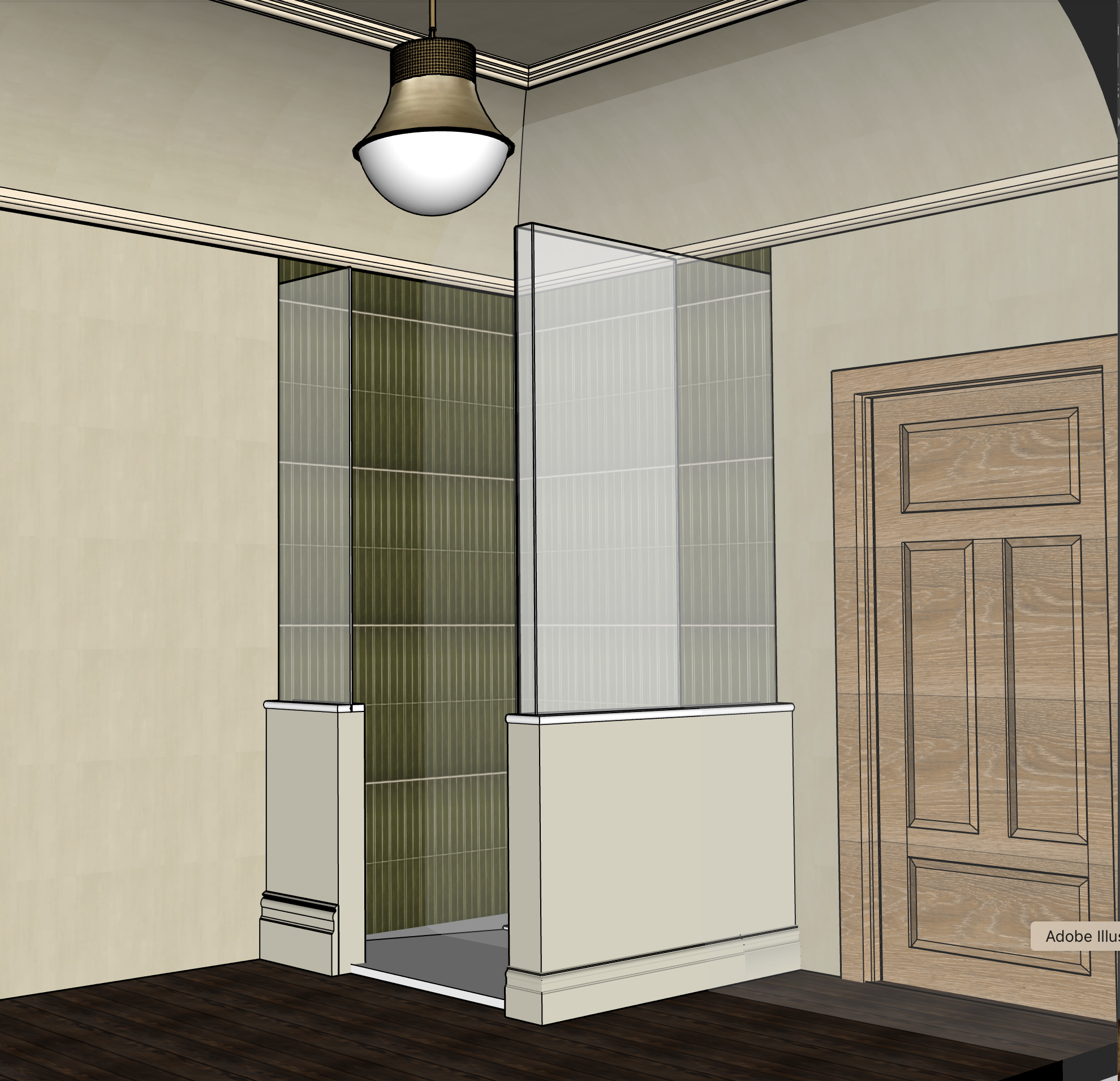 render this photorealistic lots of atmosphere look like it was taken on an slr camera satin paint texture on the wall gloss sheen on wall tile glass texture on transparent section of shower reclaimed oak door artisan tile off white grout diffused light atmospheric warm natural light coming from the left
