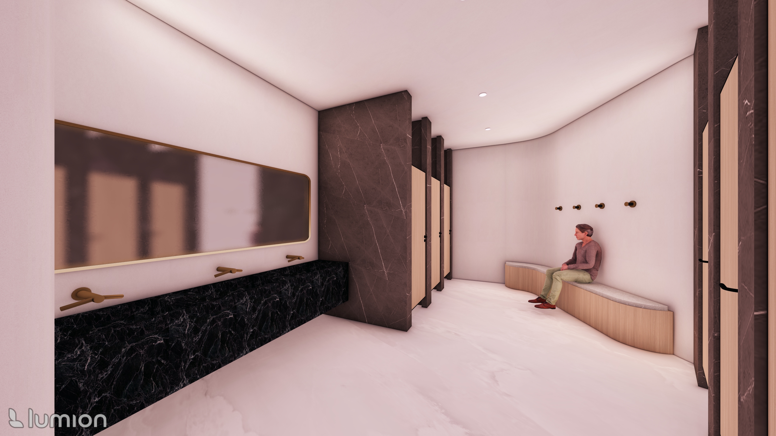 la modern luxury men s restroom and changing area designed with a warm minimalist aesthetic the space features a long black marble vanity with integrated basins and sleek brushed gold fixtures paired with an oversized rectangular mirror framed in gold adjacent to the vanity private cubicles are enclosed with dark marble partitions and light timber doors creating a refined material contrast soft white stone flooring brightens the room complemented by recessed ceiling lights that add a clean contemporary ambiance along the far wall a built in curved timber bench with an upholstered cushion provides a waiting or changing area where a man is seated adding a sense of scale and usability minimal gold wall hooks offer functional detail and reinforce the upscale design language the overall atmosphere is elegant calm and spa like rendered in a high end lumion visualization style with smooth surfaces and soft lighting