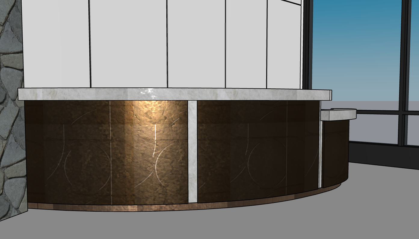 a modern curved reception desk exudes understated luxury topped with a honed taj mahal quartzite countertop in soft white with subtle gray veining the front of the desk is clad in a dark warm toned refined bronze metal surface articulated with an elegant large scale etched pattern the metal panels feature softly incised flowing curved lines that sweep across the surface in gentle arcs intersecting subtly and extending from panel to panel these lines are delicate and precise appearing lightly engraved rather than deeply carved creating a refined sense of movement without overpowering the design the pattern reads almost like overlapping circular segments or abstract geometry giving the surface a sculptural architectural quality fine panel joints are visible organizing the etched curves into a grid like composition that adds structure and rhythm warm bronze and muted gold undertones shift subtly across the surface while the satin metal finish diffuses light evenly allowing the etched lines to catch highlights softly and reveal depth through shadow and reflection the result is a tactile yet restrained metal surface that feels bespoke contemporary and meticulously crafted an inset of honed taj mahal quartzite is seamlessly integrated into the desk front heightening the contrast between the smooth stone and the patterned metal while emphasizing layered detailing and material richness the desk is set against smooth off white vertical wall panels and accented by a flagstone column composed of irregular natural gray stones introducing organic texture to the space soft ambient lighting enhances the etched pattern and tonal variation of the bronze surface reinforcing the refined modern atmosphere black framed picture windows overlook a lush golf course beneath a warm summer sky allowing natural light to balance the warm interior palette dark stone flooring grounds the space and complements the bronze metal tones completing a sophisticated interior defined by clean lines minimal detailing and architectural restraint follow the pattern that is shown in the image exactly