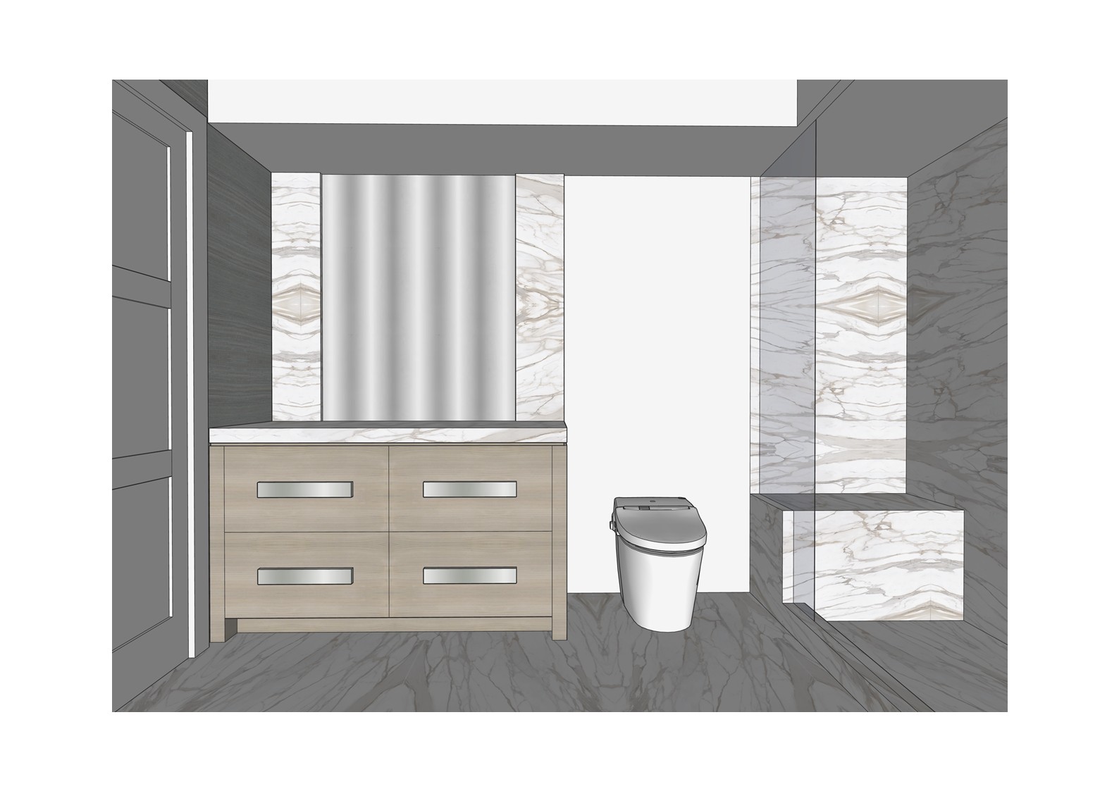 transform the provided elevation into a hyper realistic interior photograph that is indistinguishable from a real professionally shot interior design photograph this must read as a real space captured by a camera not a rendering not a visualization not architectural cg not concept art and not an illustration geometry lock non negotiable preserve the exact original geometry layout proportions ceiling details wall depths panel divisions openings doors cabinetry locations millwork dimensions built ins and circulation paths with zero architectural changes nothing may move scale simplify or be reinterpreted geometry must remain absolutely unchanged camera derivation critical derive the camera position height angle and framing strictly from the uploaded elevation eye level interior photography centered or naturally balanced composition 24 35mm interior lens feel no dramatic angles no stylized framing do not reuse or approximate camera framing from any previous image remove all drawing artifacts completely remove all linework cad edges drafting outlines diagrammatic shapes sketch artifacts nothing may appear outlined flat schematic or illustrative the elevation must be visually reinterpreted as a finished real interior photograph material realism rules wood if present smooth solid plank material extremely subtle restrained grain matte or soft satin finish only no graphic patterns no decorative striping no visual noise wood must absorb light gently never glossy or sharp fabric upholstery if present soft compression subtle seams gentle shadowing natural fabric texture no flat color blocks stone slabs if present light natural veining soft organic variation low contrast no symmetry no bold or busy patterns stone must feel heavy and grounded walls fine surface texture slight tonal variation never flat paint edge construction realism all edges corners joints and transitions must be softly broken and physically realistic no razor sharp corners no cgi perfect edges slight construction tolerances only everything must read as fabricated installed and dimensional lighting photographic behavior lighting must behave like real high end interior photography natural daylight only unless otherwise specified realistic light bounce gentle shadow falloff uneven exposure distribution subtle brightness variation across surfaces avoid studio lighting uniform illumination over clean exposure global illumination look slight softness is preferred over sharpness camera image imperfections very important introduce subtle photographic characteristics gentle lens softness micro exposure variation natural contrast roll off mild atmospheric depth primary plane sharp background slightly softer the image must feel captured not generated absolute constraints no creative interpretation no stylization no exaggeration no added or removed elements any deviation from the original elevation geometry or intent is unacceptable negative prompt always include architectural rendering 3d visualization cgi unreal engine octane vray sketchup look flat textures graphic lines outlined edges over sharpened studio lighting concept art illustration ai look plastic materials glossy wood high contrast grain perfect symmetry all the walls are the same as the bench in the shower side walls look darker only becasue it is a shaddow