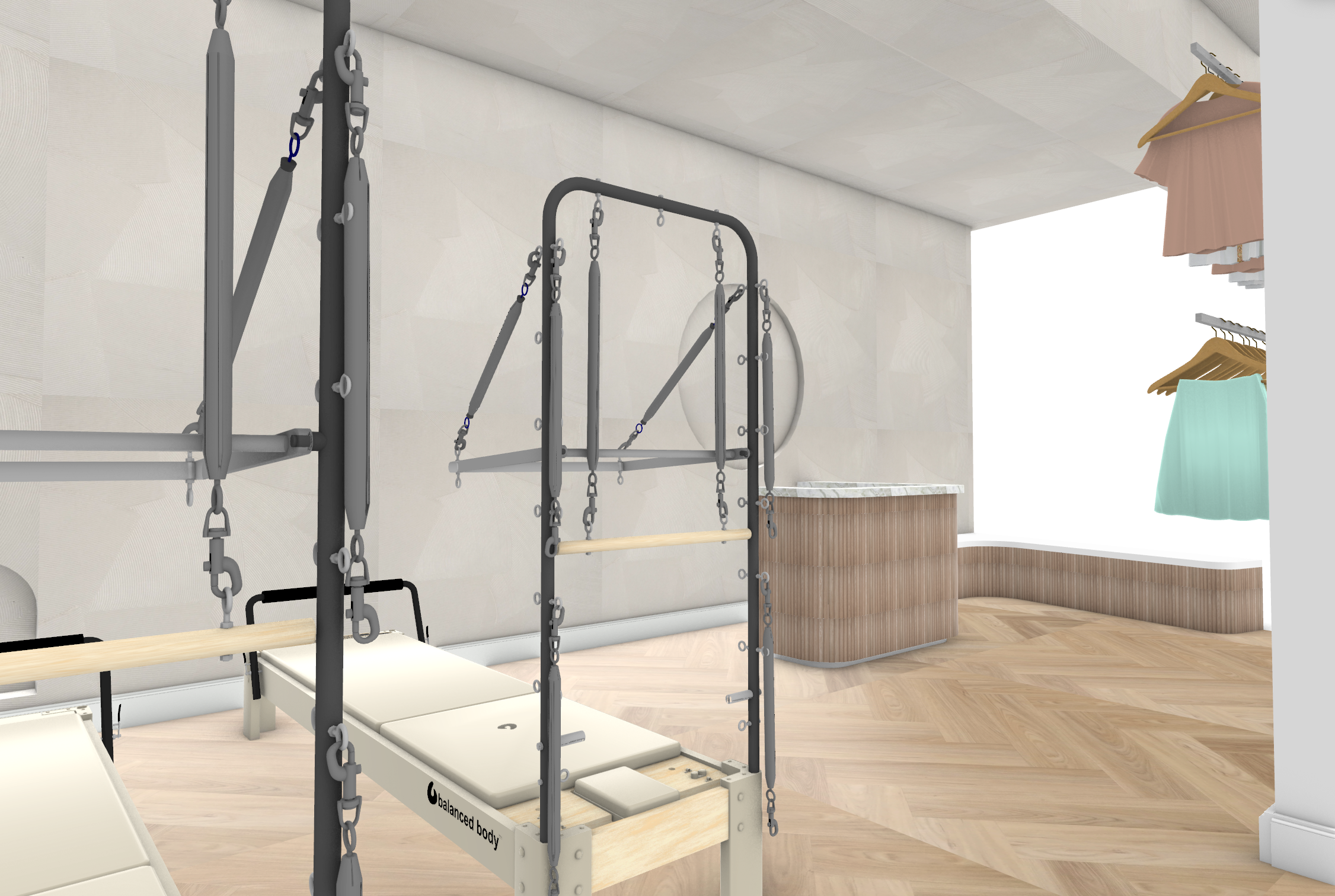 refine this image to match the exact style materials lighting and level of realism of the previously finalized pilates studio renderings do not change layout camera angle or composition only upgrade materials lighting and detailing for consistency update all materials and finishes to match the established design language walls and ceiling should be warm cream polished plaster with soft tonal variation and a slightly warm glow not flat or gray flooring should be warm natural oak herringbone richer in tone with realistic grain variation and subtle reflectivity ensure all wood elements match the same warm high end oak tone used in the other renderings update the lighting introduce soft warm ambient lighting throughout the space add integrated led strip lighting along architectural edges and base details where appropriate ensure arches have a warm backlit glow overall lighting should feel golden soft and diffused not cool or flat refine the mirror wall left side make it a clean full height mirror with subtle warm reflections ensure reflections match the updated lighting and materials upgrade the pilates equipment use premium finishes consistent with the other renders warmer wood tones refined upholstery realistic metal detailing improve realism of materials edges and shadows refine the arches on the back wall apply antique bronze mirror panels with warm tones and subtle patina add integrated warm led lighting within the arches to create depth and glow enhance overall realism add subtle imperfections to all materials wood grain variation plaster texture slight wear improve reflections shadows and global illumination ensure the scene feels cohesive warm and high end maintain all geometry and placement exactly as is