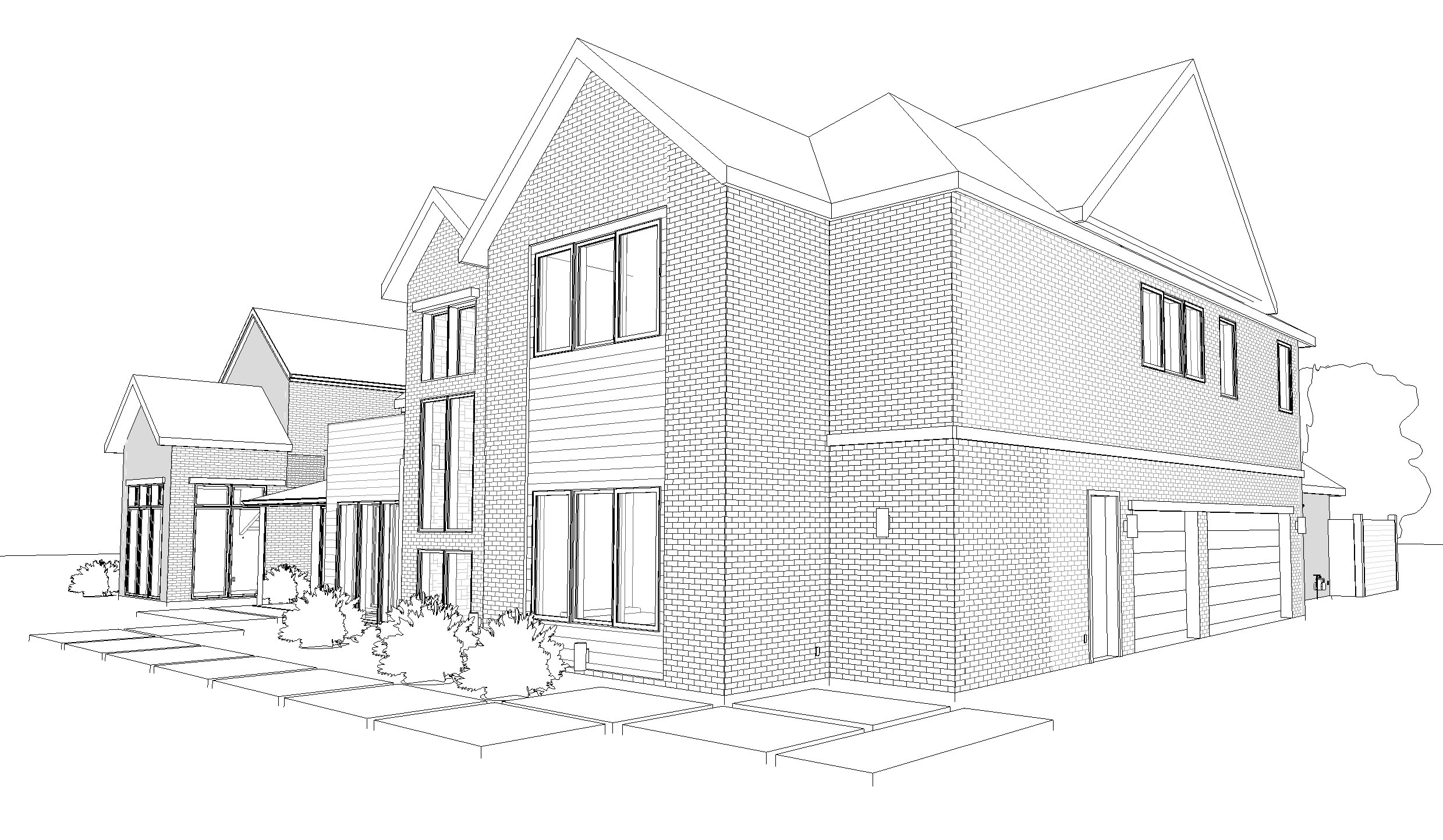 dark purple black brick warm wood siding grey stucco warm wood garage doors no glass grey over casted day wet dive way black roof
