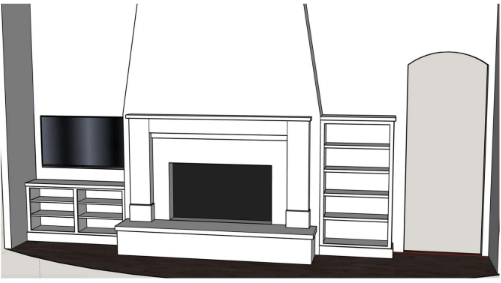 render this sketch with neutral modern tudor style fireplace with built ins on both sides