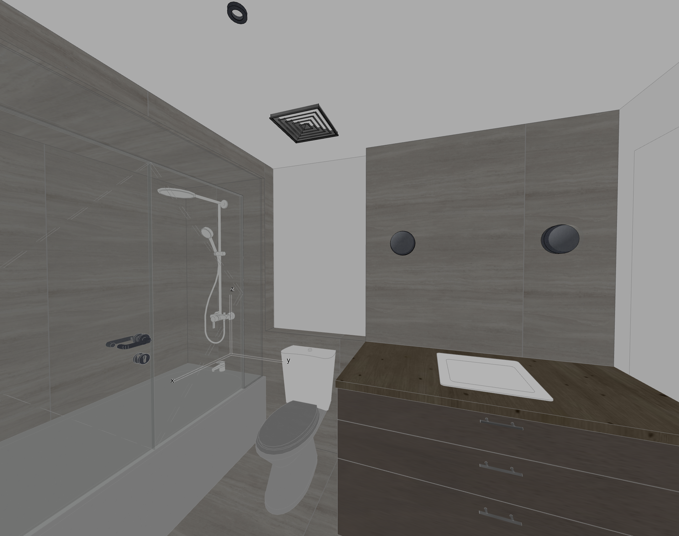 trastevere beige tile use honed finish for stone use whitewash oak for the wood beam and door jamb doors and cabinets show mirror above the vanity use brushed light gold plumbing fixtures dont add window dont change materials dont add tile where tile is not shown