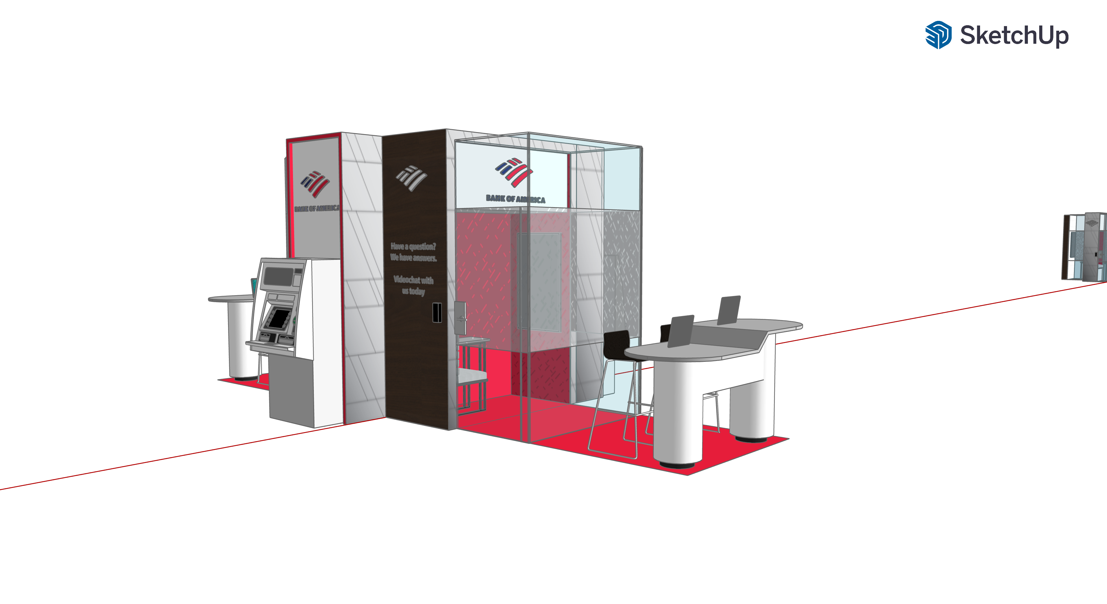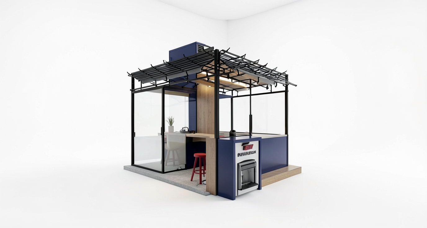 modern architectural kiosk rendered in a seamless white studio environment background pure white infinite studio backdrop no walls no windows no visible room corners no environment context soft white floor to background cyclorama with no horizon line lighting soft studio lighting setup large diffused key light from front left at 45 degrees subtle fill light from right soft top light for canopy shadow definition clean contact shadows under base no environmental hdri room reflections camera move camera closer to kiosk frame subject prominently reduce empty floor space 3 4 front perspective 35mm lens eye level camera height kiosk should fill approximately 70 80 of frame minimal negative space materials keep all materials realistic maintain glass reflections preserve navy wood black slats and red stool finishes no color desaturation render style photorealistic studio product visualization crisp edges soft natural shadows even exposure no dramatic contrast no background scene elements
