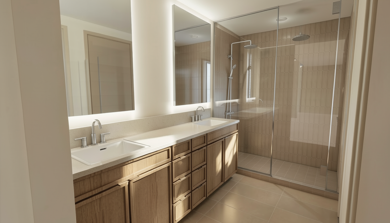 use the uploaded render as the exact base image maintain the original camera angle lens length perspective framing composition and spatial proportions exactly as shown do not alter architectural elements wall locations ceiling details millwork flooring layout window placement or built ins preserve all existing materials finishes textures paint colors tile stone wood tones and lighting design exactly as they appear maintain the same daylight direction shadow quality exposure and overall color temperature keep all furniture decor styling and layout exactly the same unless explicitly instructed otherwise do not reinterpret the design restyle the space modernize it or adjust proportions only modify the specific items that will be listed in the next prompt the goal is to enhance realism and material fidelity while preserving the original design intent 1 1 output should be ultra photorealistic with natural material depth accurate reflections realistic fabric texture subtle imperfections and true to life lighting eliminate reflections on shower glass