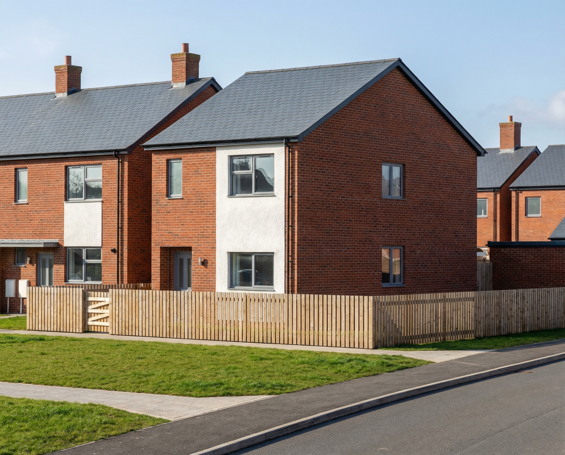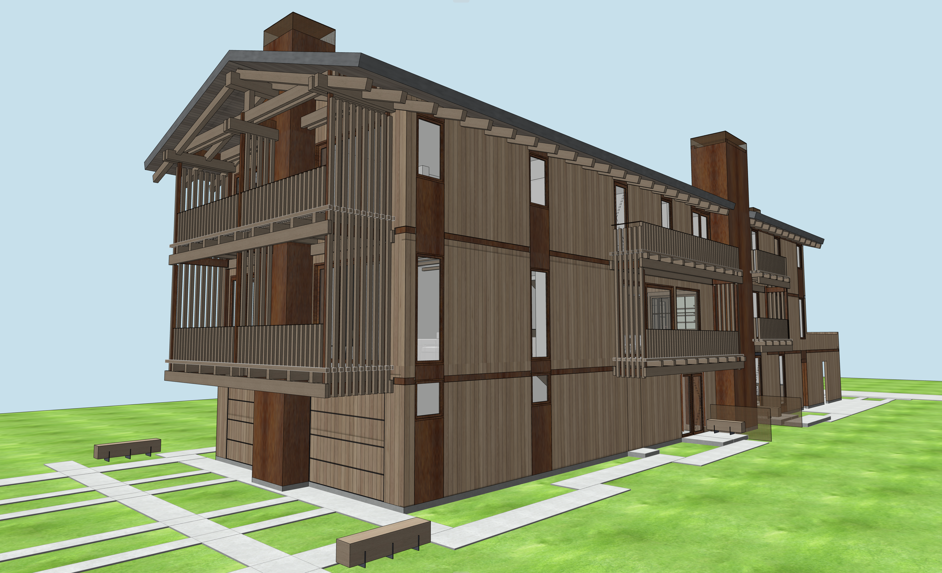 maintain rusted metal chimney add small green bushes on either side of the building add small aspens and pine trees on either side of the building and slightly in front add basic homes that are 1 story in the style typical of the 1980 s with gable roofs that are mostly transparent next to the site add green hill behind off in the distance