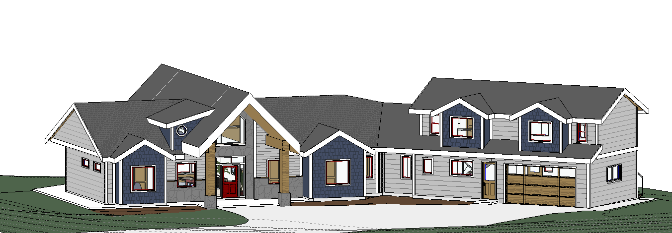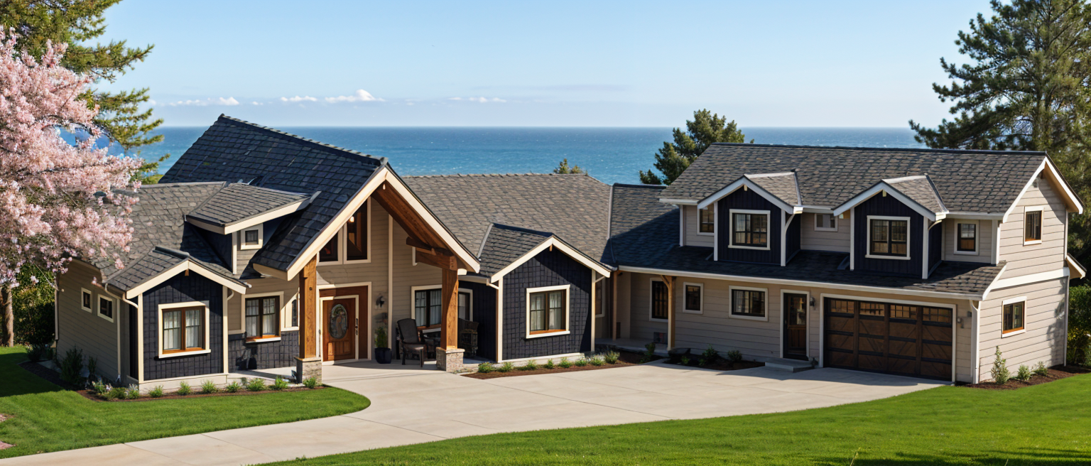 please make it a nice sunny day put this house on an acreage with a long driveway add an ocean background add surrounding trees including a cherry tree in bloom add nice minimal landscaping around the house but especially in the flower beds in the front you can include trees behind the house too make sure to use the same materials and colors as the provided photo make realistic the front entry is covered in rock siding all trim is white the dormers are in a dark blue shake siding the rest of the house is a light grey lap siding
