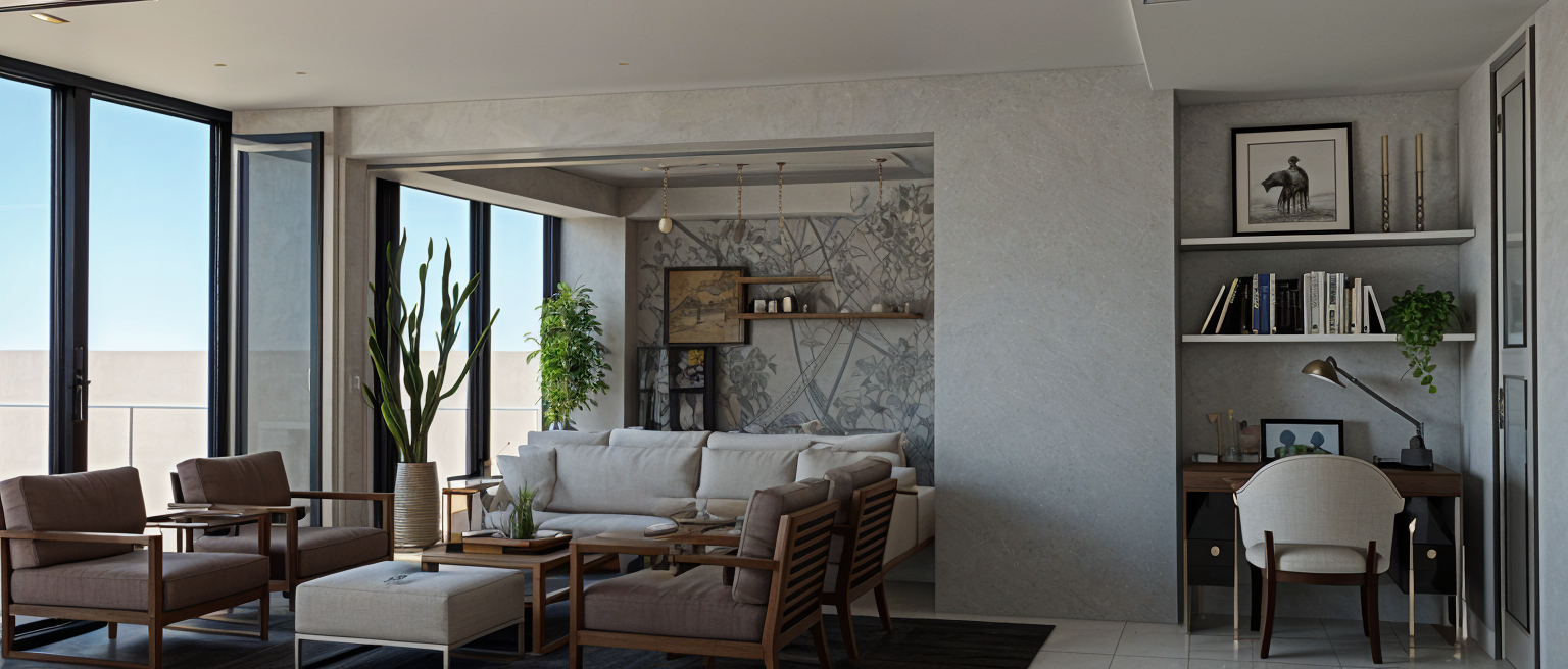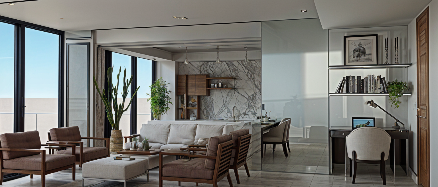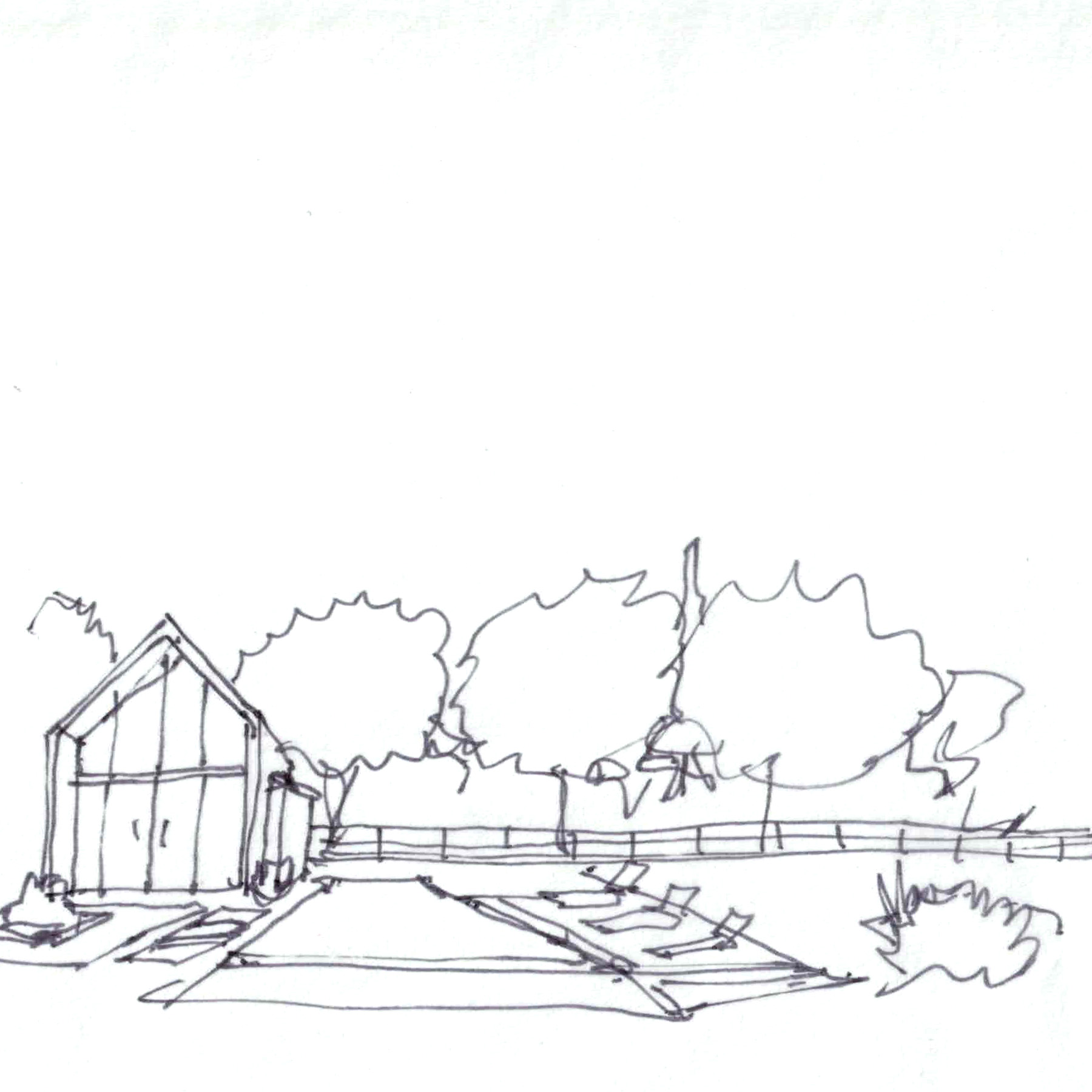 modern casita with storefront face firepit pool pool chairs golf course behind fence