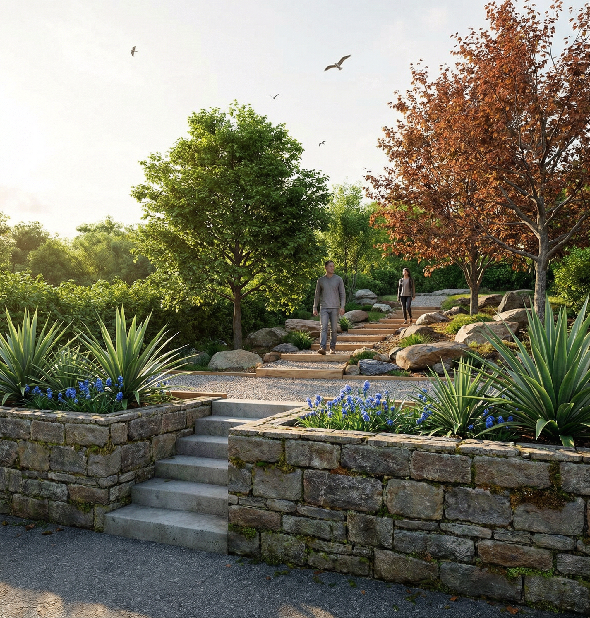 seat is timber one solid piece rock face is 3m high with small cave older person in their 60 s sitting on seat corten fire pit