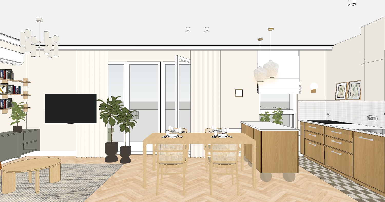 generate a realistic interior in a modern style with bright natural daylight lighting do not change any existing elements or color schemes the furniture should remain semi matte the upper part in a cashmere color with a slight rounding at the end the lower part of the cabinets made of oak veneer the flooring materials remain the same with tiles in the kitchen area as visible in the photo add lighting while maintaining coherence and realism throughout above the table place hanging lamps model lee from westwing https www westwing pl lampa wisz ca lee 100389 html they are glass on the ceiling keep the small white flush ceiling fixtures model gx53 grandi ip54 from led hurt https led hurt pl pl p oprawa sufitowa natynkowa gx53 grandi ip54 okragla biala 6690 do not change them the whole should look modern elegant and natural with realistic daylight lighting soft reflections and semi matte surface finishes as in the provided photo on the right side there should be mosaic tiles on the floor ending before the kitchen island then herringbone flooring the lamps should emit a soft glow do not change any lamps and colours they should remain as they are the lamp should be lit and cast the light in the room do not added any lamps add light to wall lamps and small ceiling lamps make a brighter visualisation