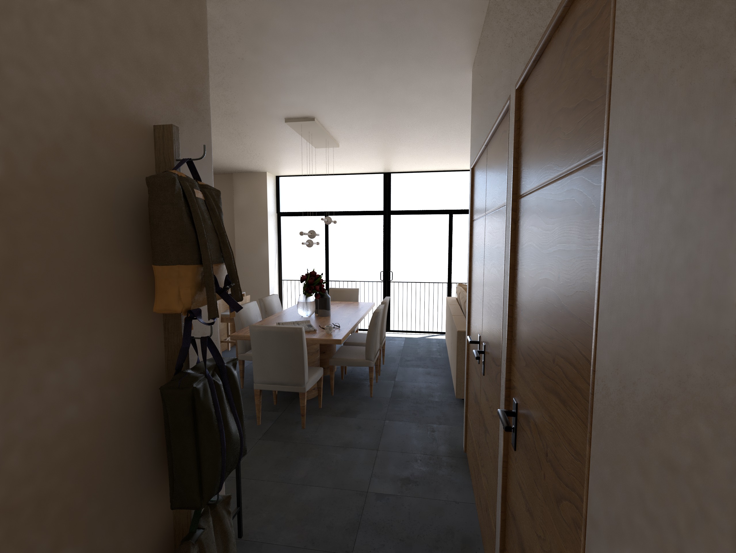 create a photorealistic enhancement of this luxury penthouse entry corridor dining space interior render maintain all existing furniture decorative elements textures wooden dining table with white place settings white dining chairs black bicycle fixture on wall wooden coat rack hook light wood warm tan wooden doors with subtle warm orange undertone on the right side wooden cabinetry with metallic hardware white walls dark flooring pendant lighting and all architectural elements with their current colors and forms critical specification wooden doors preserve and enhance the characteristic warm light wood tone of the doors on the right side ensuring they maintain their subtle warm orange tan undertone approximately 10 warm orange saturation these doors should appear as warm honey toned natural wood with authentic grain texture not pure neutral or cold toned the warmth should be noticeable but refined and sophisticated replace the window view with a photorealistic daytime cityscape of downtown puerto vallarta mexico not beachfront area showcasing the iconic crown topped church of our lady of guadalupe as the dominant skyline element with its distinctive baroque style ornate crown spire 710 authentic colonial era spanish architecture featuring terra cotta red tiled roofs and whitewashed facades charming old town plazas with cobblestone patterns historic buildings displaying colorful hand painted murals and wrought iron balconies lush bougainvillea vegetation adorning colonial walls a seamless blend of spanish colonial heritage with contemporary mid rise residential development palm trees distributed throughout the historic downtown landscape vibrant authentic mexican colonial character and old town energy as viewed from a high rise penthouse at approximately 18 25 floors elevation render with natural bright daylight warm golden hour color temperature approximately 4 5 pm sunlight creating rich warm light and elegant soft shadows 56 implement advanced vray photorealistic lighting deploy sophisticated global illumination with realistic caustics and light refraction through the large window glass integrate premium hdri environmental lighting for authentic puerto vallarta tropical daylight simulation add dramatic realistic warm sunlight streaming through the expansive windows creating dimensional warm light pools across the entry and dining surfaces significantly enhance all material quality add realistic wood grain depth and micro textures to dining table warm toned doors preserving orange undertone cabinetry and architectural elements with authentic natural wood color variations enhance white dining chairs with subtle fabric weave micro textures and realistic light absorption properties render dark flooring with realistic surface finish showing subtle reflections and material properties add sophisticated surface details to white walls with realistic paint micro imperfections and warm ambient light modeling enhance black bicycle fixture with matte metallic properties and realistic light absorption render metallic hardware with appropriate reflective qualities improve lighting dynamics create dramatic warm directional light from the penthouse window creating sophisticated shadow patterns across the entry corridor and dining area add realistic light bounce from warm wood tones doors table cabinetry creating elegant ambient fill light throughout the space implement proper light interaction with all surfaces showing realistic diffuse and specular behaviors enhance reflections on glass window surfaces showing the puerto vallarta cityscape and sky add depth to all materials through proper ambient occlusion apply premium color grading with warm sophisticated welcoming entry ambiance luxury penthouse hospitality with elegant natural light and warm tones implement realistic ambient occlusion for shadow depth in all corners and architectural details include subtle cinematic depth of field with primary focus on the dining table area ensure warm wooden door tones are photographically accurate and beautifully illuminated ensure overall aesthetic conveys a sophisticated penthouse entry foyer with museum quality architectural design and refined natural lighting final render must achieve premium architectural interior photography quality with 8k resolution clarity professional styling and cinematic elegance