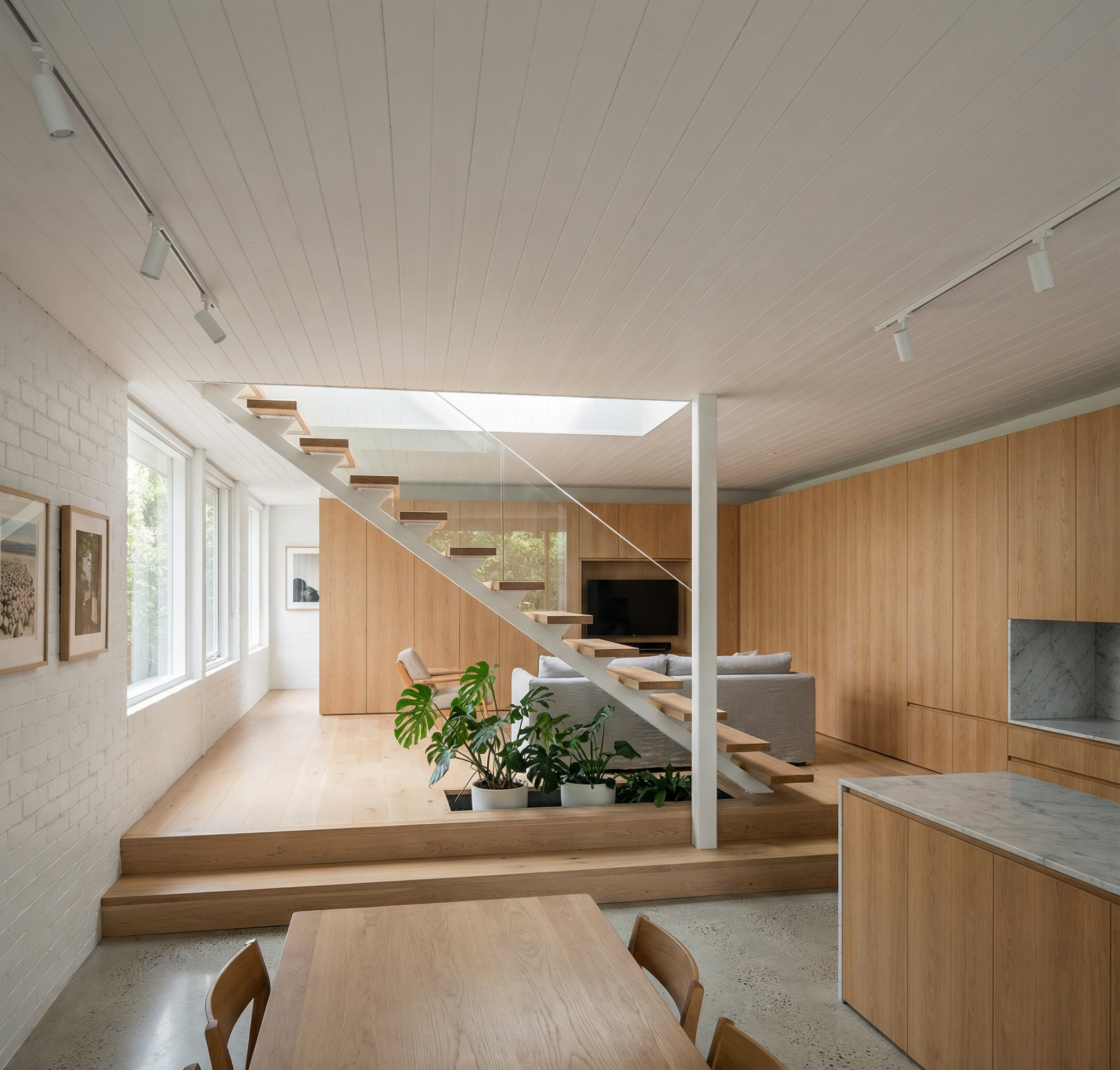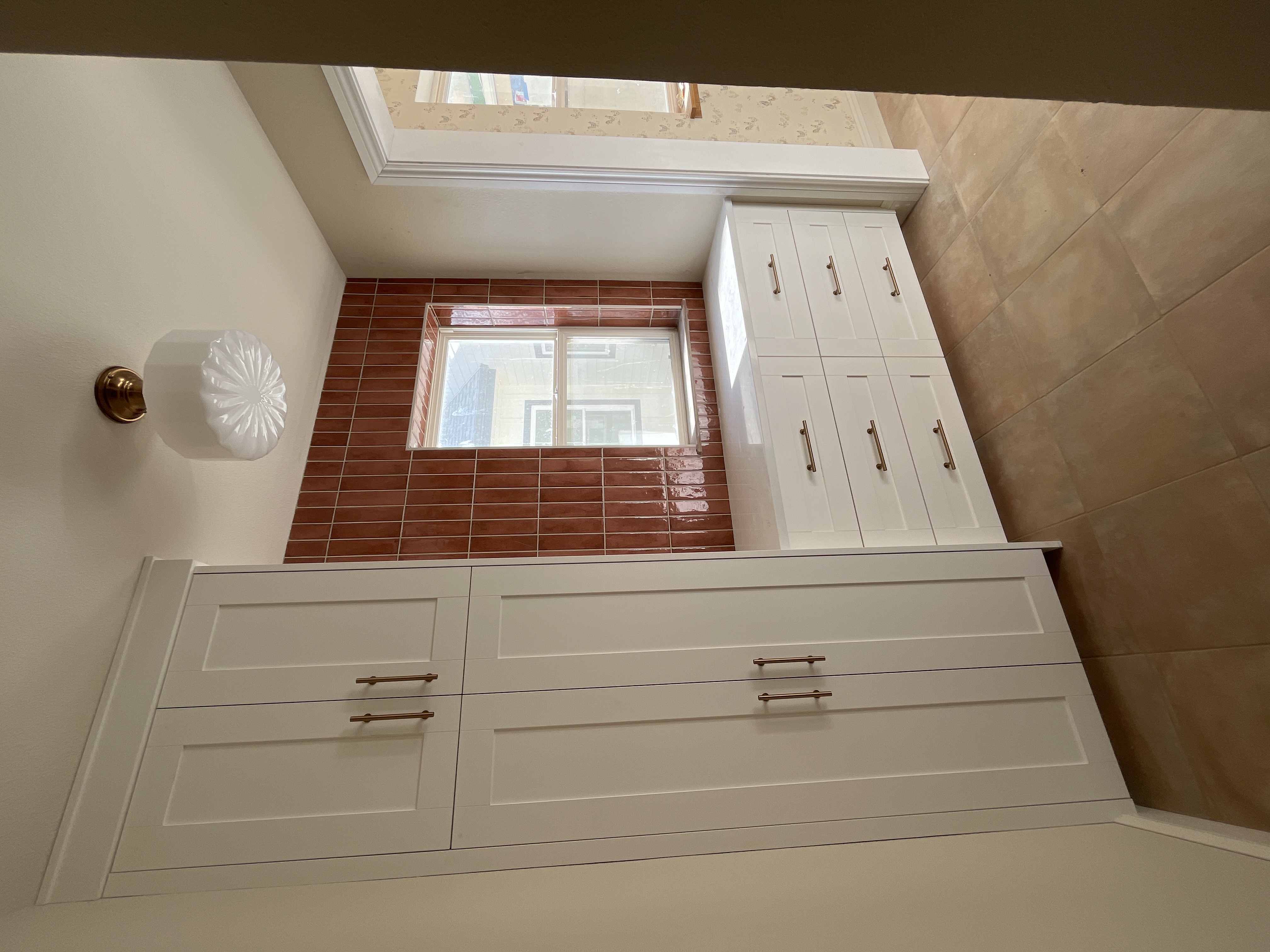 do not change the cabinets in any way preserve the exact cabinet colors materials finishes dimensions door and drawer styles hardware spacing alignment and all geometry exactly as shown do not alter the countertop shape backsplash appliances flooring lighting fixtures or wall structure only remove the construction materials clutter and mess from the scene clean the room and make it look finished and staged add a few simple tasteful home accessories appropriate for the style of the space but do not add or remove any furniture windows or architectural elements maintain the original lighting direction and realism enhance clarity and polish the photo while keeping the cabinetry and room design completely unchanged do not alter the lighting to keep the cabinet colors as they are in the image stage for a dressing room natural lighting and a nice landscape in the window change the red tile to a light green