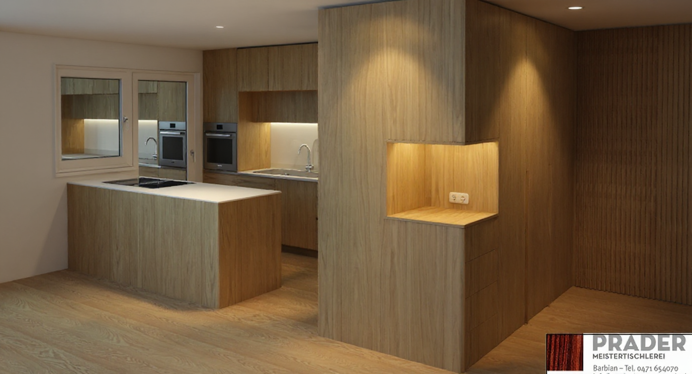 sunny day in the kitchen and more brightness in the room led strip over the sink with 3000k the oven in platin like the vzug spotlights on the top in front of the cabinets and over the kitchen island more brightness in the room the right niche without led spot more light on the right side