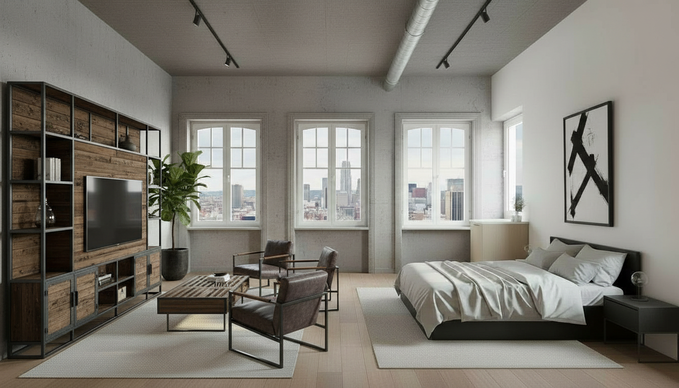 enhance this architectural interior render to achieve a clean photorealistic result while keeping the exact same design and geometry do not change add remove or move any objects scene description a modern meeting room with a matte gray epoxy resin floor in the center there is a rectangular natural wood table surrounded by light wood chairs with metal legs at the back there is a wooden kitchen with upper and lower cabinets including a sink and cooktop the walls are finished with dark wood panels on the right side there is a glass wall with black metal frames on the left side there are large glass doors windows the ceiling has white perforated acoustic panels with suspended circular ring lights from the regent circular lighting series the lights are hanging from the ceiling with thin visible suspension cables clearly defined and physically accurate subtly catching light so they can be seen realistically without being exaggerated materials should look realistic natural wood grain matte epoxy resin floor and high quality architectural materials lighting should be soft natural and professional similar to interior architectural photography use realistic global illumination and soft shadows the glass must remain clean and subtle with very soft reflections and high transparency avoid strong reflections or mirror like effects the exterior visible through the glass must remain neutral and empty with no buildings people or objects visible outside keep the original composition furniture proportions and architecture exactly the same only improve lighting material realism texture quality and overall photorealism