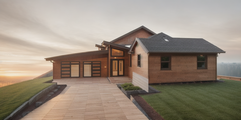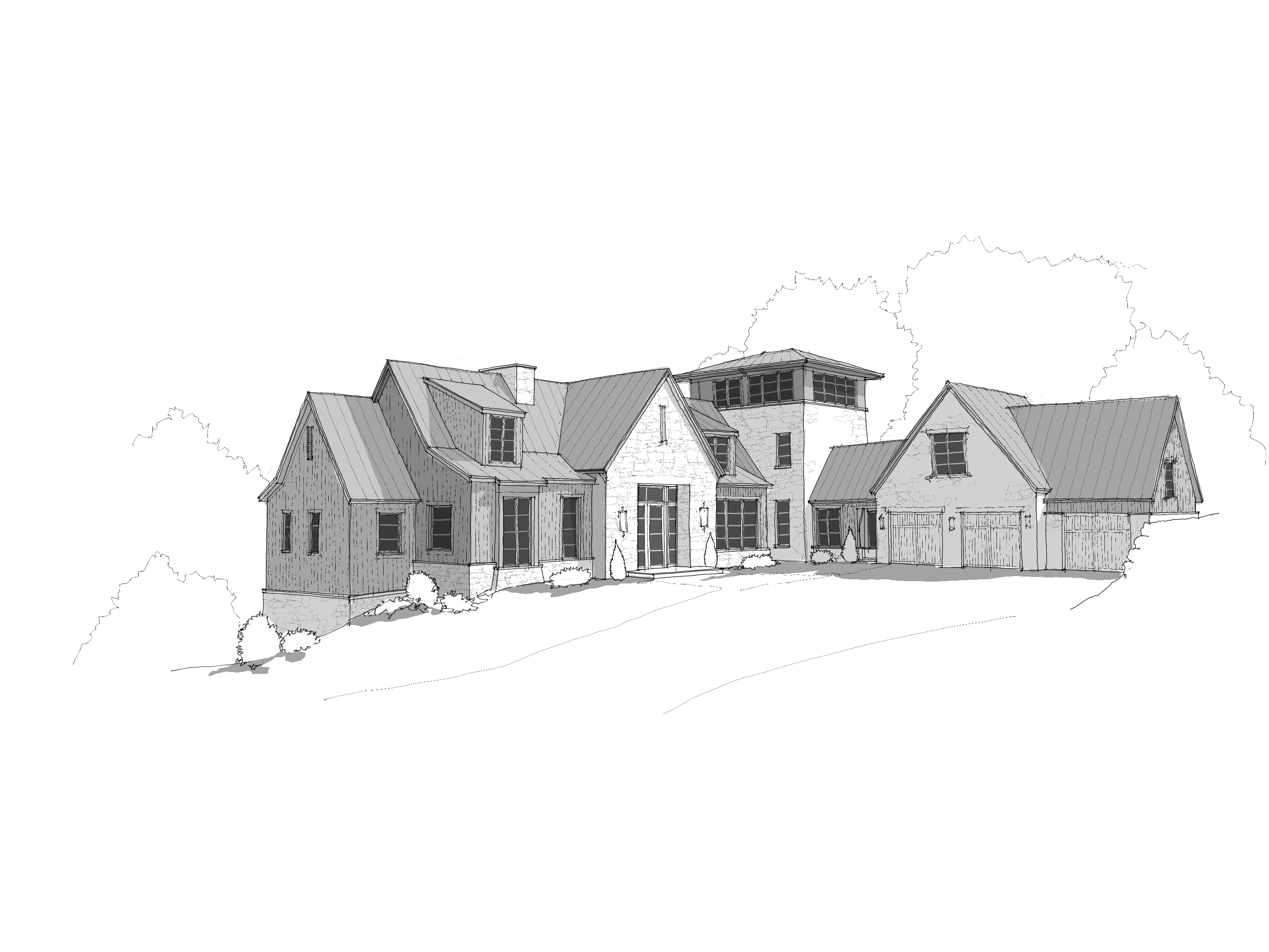 modern english home with black standing seam metal roof dark gray vertical siding and trim light limestone material set into hillside with lush vegetation and lake view in the distance dusk setting with soft glow of lights coming from windows architecture