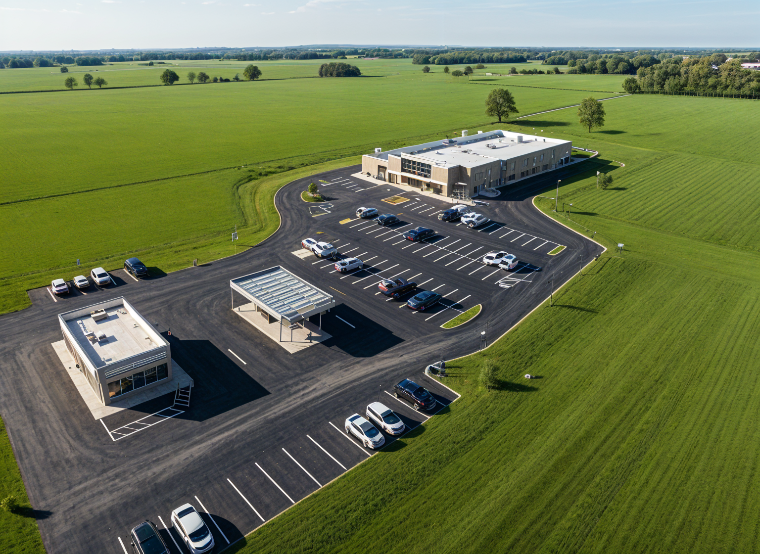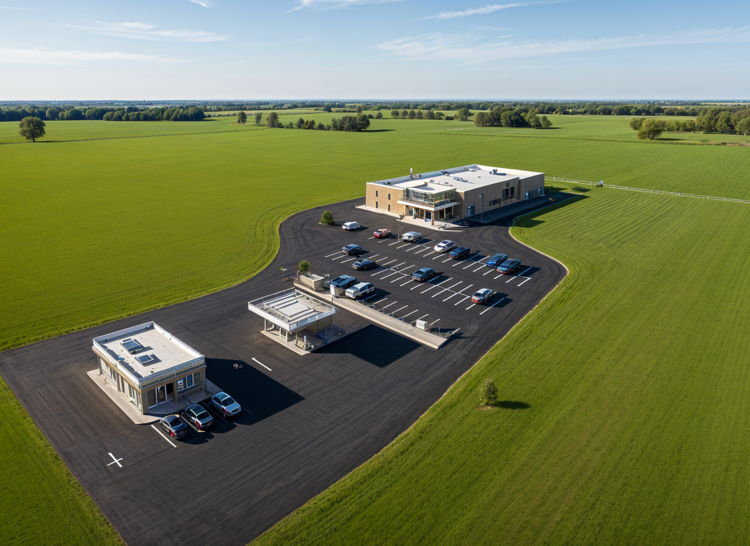 parking lot in front of the store add a few cars sunny weather blue sky slightly overcast small trees in the background in some distancnce in the background flat green areas don t change perspective