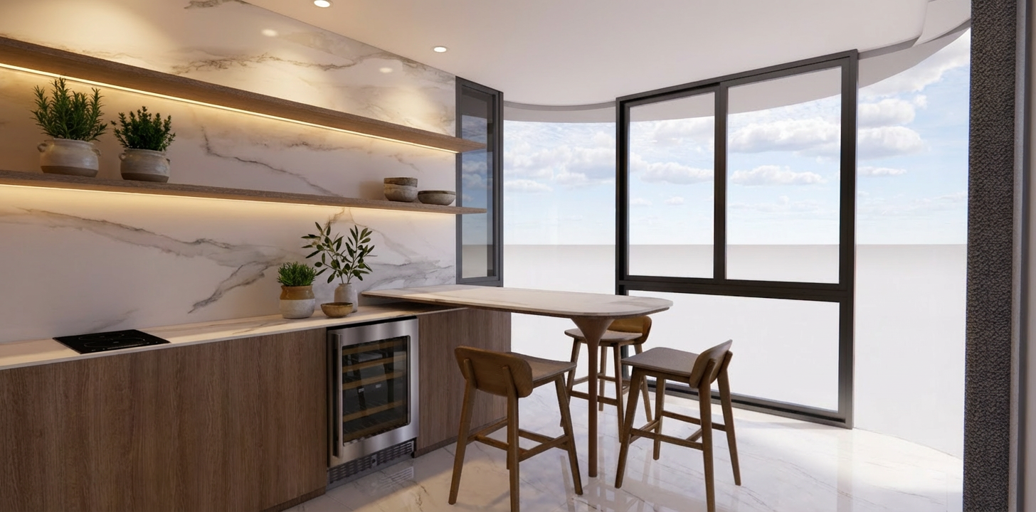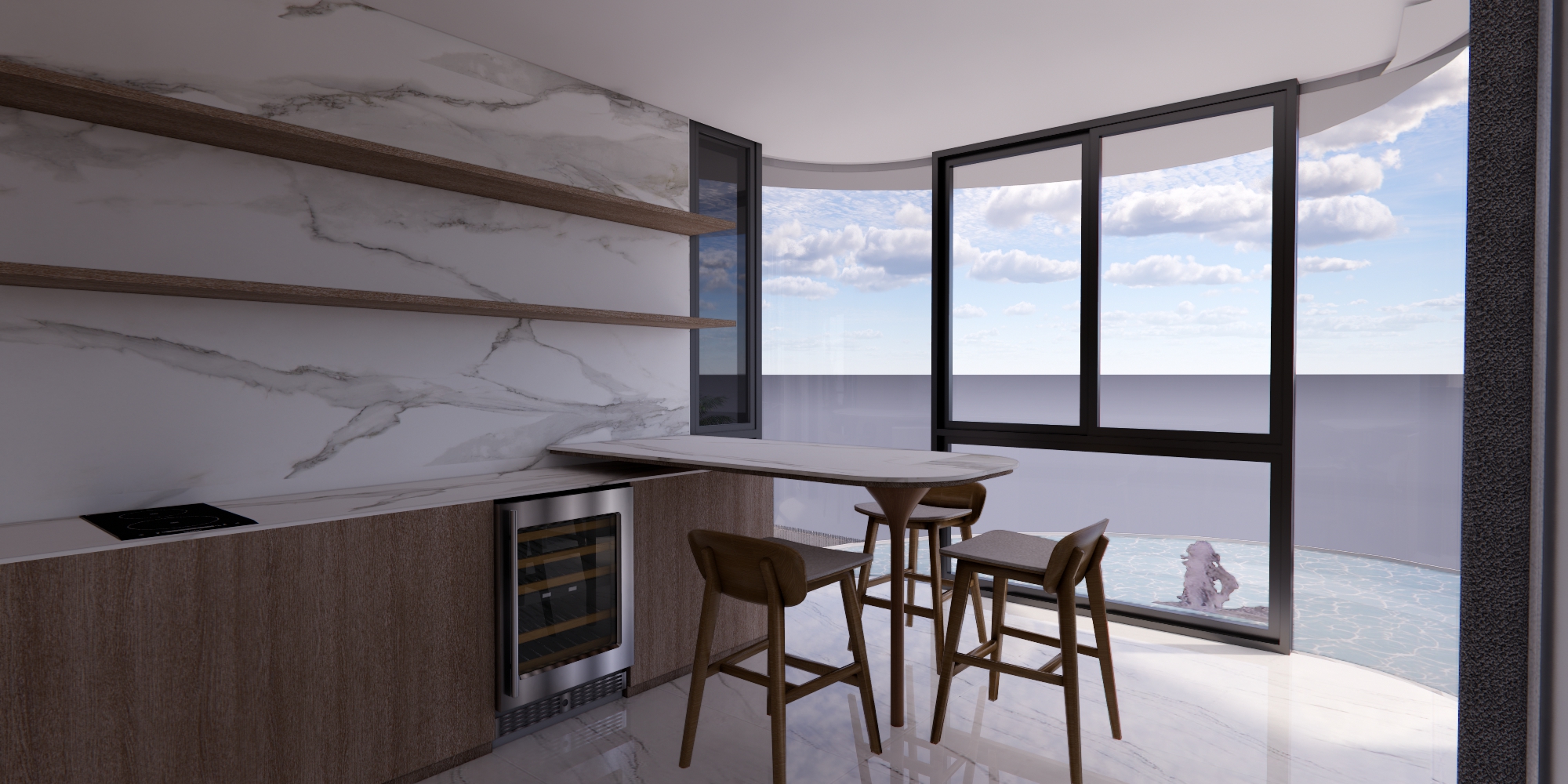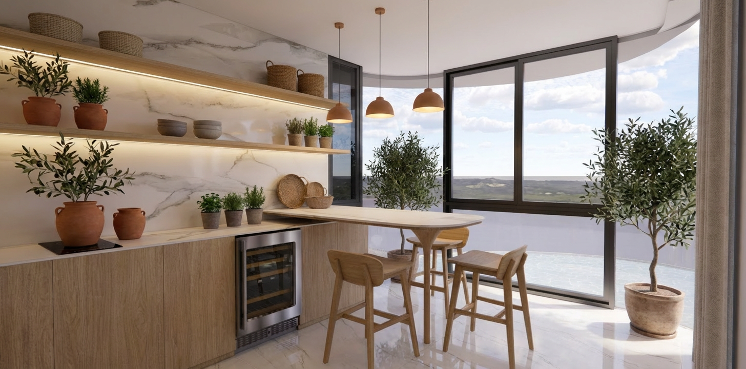 key everything including materials finishing touch up with mediterranean themed plants wood in light oak decor but do not obstruct any doors or openings add lights above do not add ocean outside