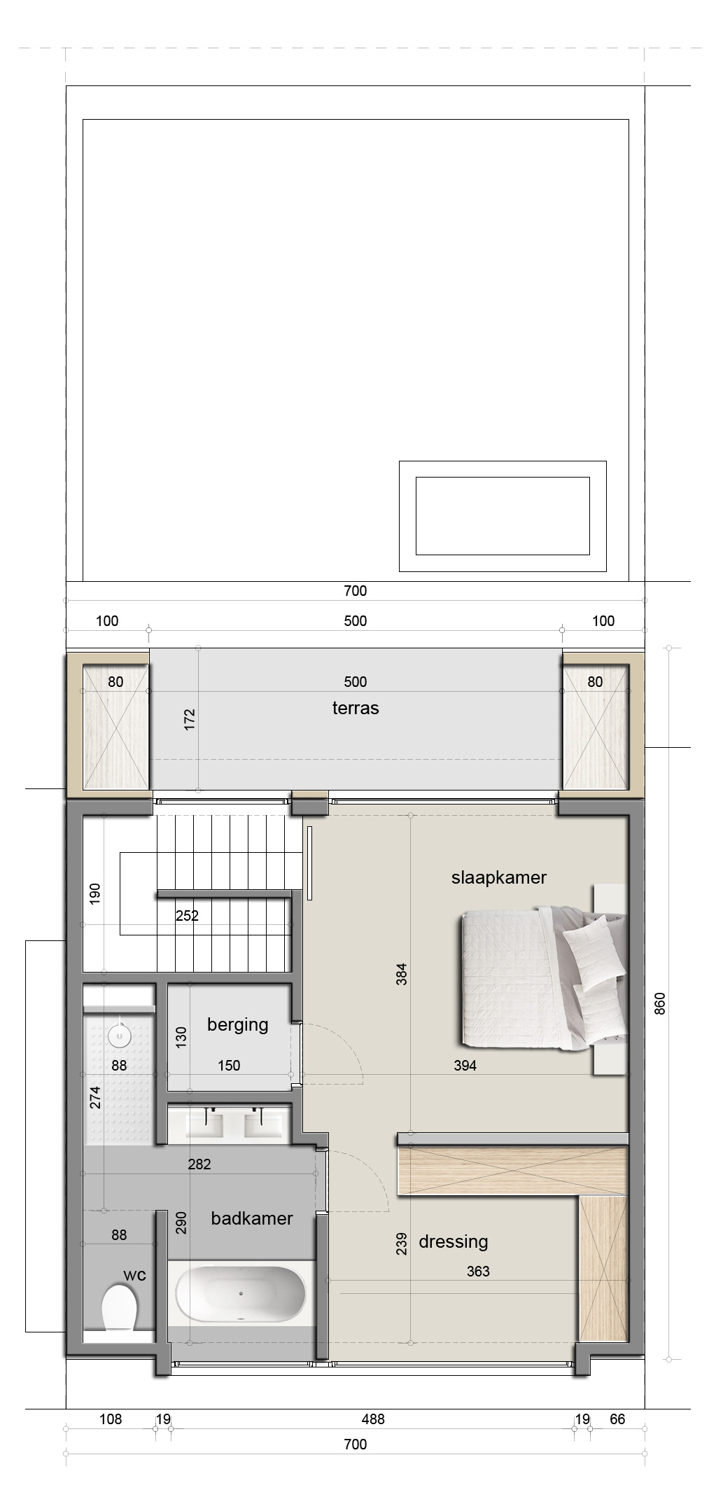 convert this floor plan into a realistic isometric 3d view of a full house show the space from an elevated angle with furniture walls and details visible analyze the provided floor plan walls are shown has white all windows are started from ground level generate the provided auto cad style 2d residential floor plan into a high quality top down 3d isometric true 90 orthographic architectural photorealistic rendering floor plan keeping the exact same dimensions proportions walls doors windows and furniture placement as shown do not change layout scale or orientation flooring light square tile 60cm style interior modern japanese japan with a soft neutral color palette of beige cream and light wood tones light natura warm neutral tones beige off white soft grey minimalist furniture clean lines built in cabinetry stone or microcement surfaces matte black accents furnish the existing rooms in a modern aesthetic elegant interior light soft ambient interior lighting and soft natural daylight with subtle shadows architectural visualisation distortion no added or removed elements keep the tops of the walls cleanly cut and white to show the layout clearly no extra furniture no changes to setup furniture no extension of terras terras only between 2 outside closets no open windows outside use the same furniture as shows on the plan do not change the orientation of the floorplan