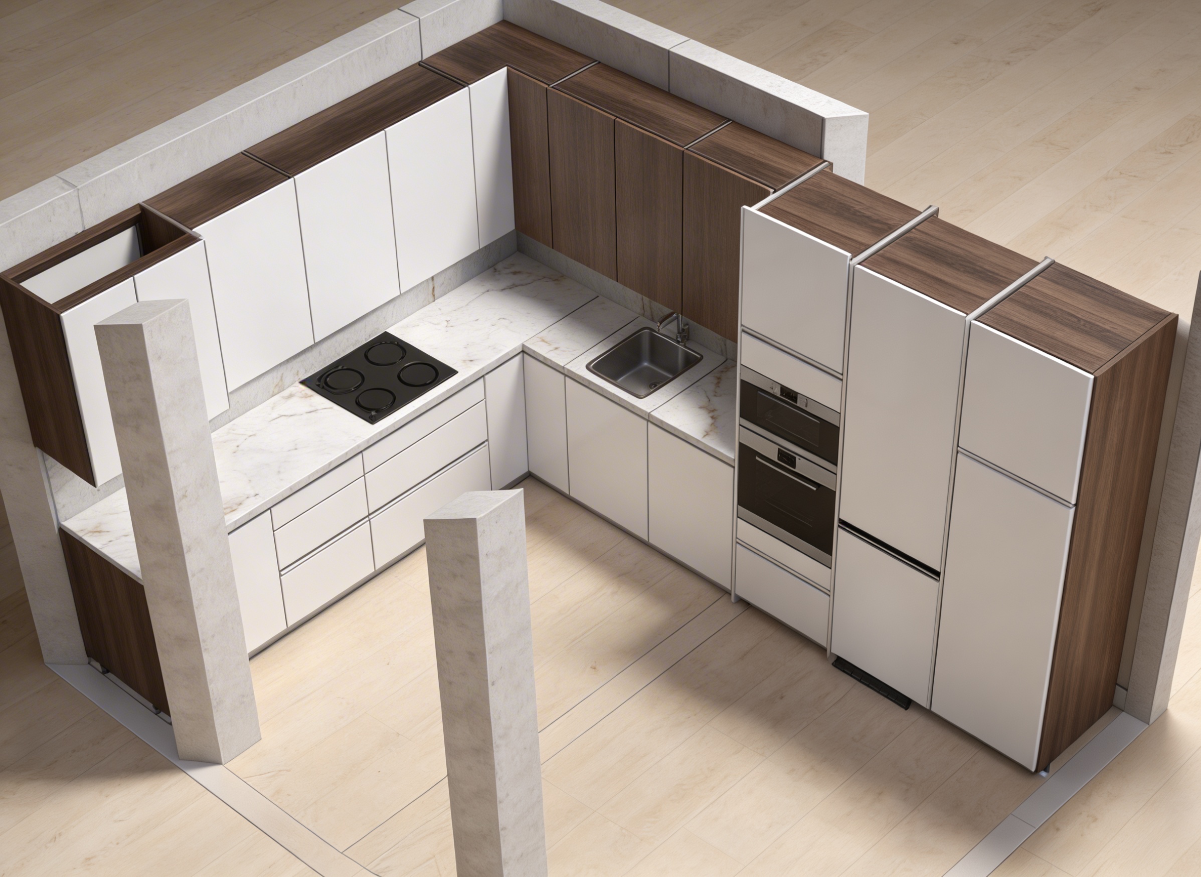 integrates sink and ovens into the kitchens