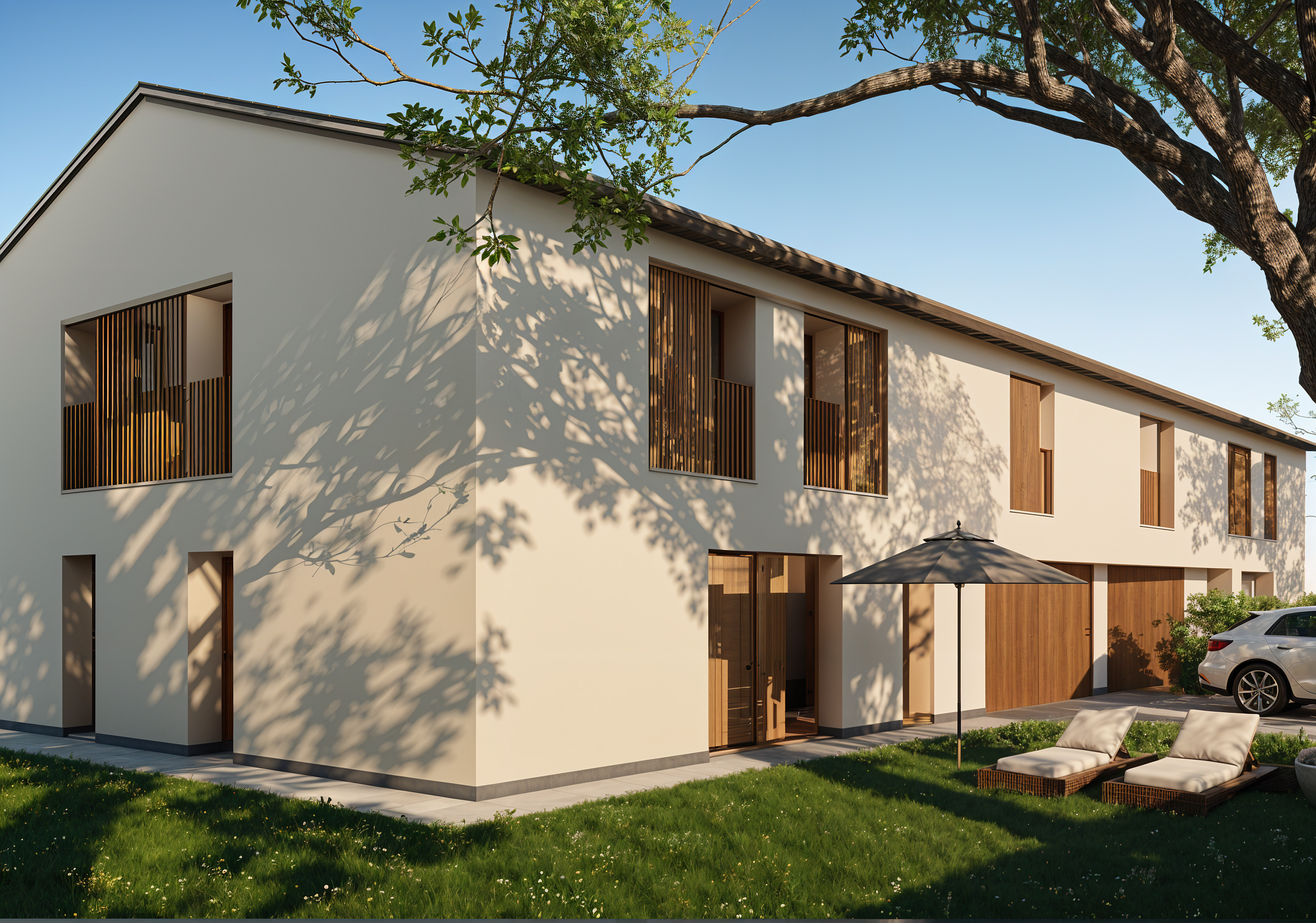 render a modern house in a serene sunny suburban setting the building features a light beige facade accented with dark gray window frames and roof trim sunlight filters through the branches of a leafy green tree casting playful shadows on the house s surface a well manicured lawn with vibrant green grass surrounds the scene include a sleek white car parked outside an open patio with cushioned loungers in soft gray tones and a dark patio umbrella adding shade the sky above is clear and blue contributing to a peaceful inviting atmosphere